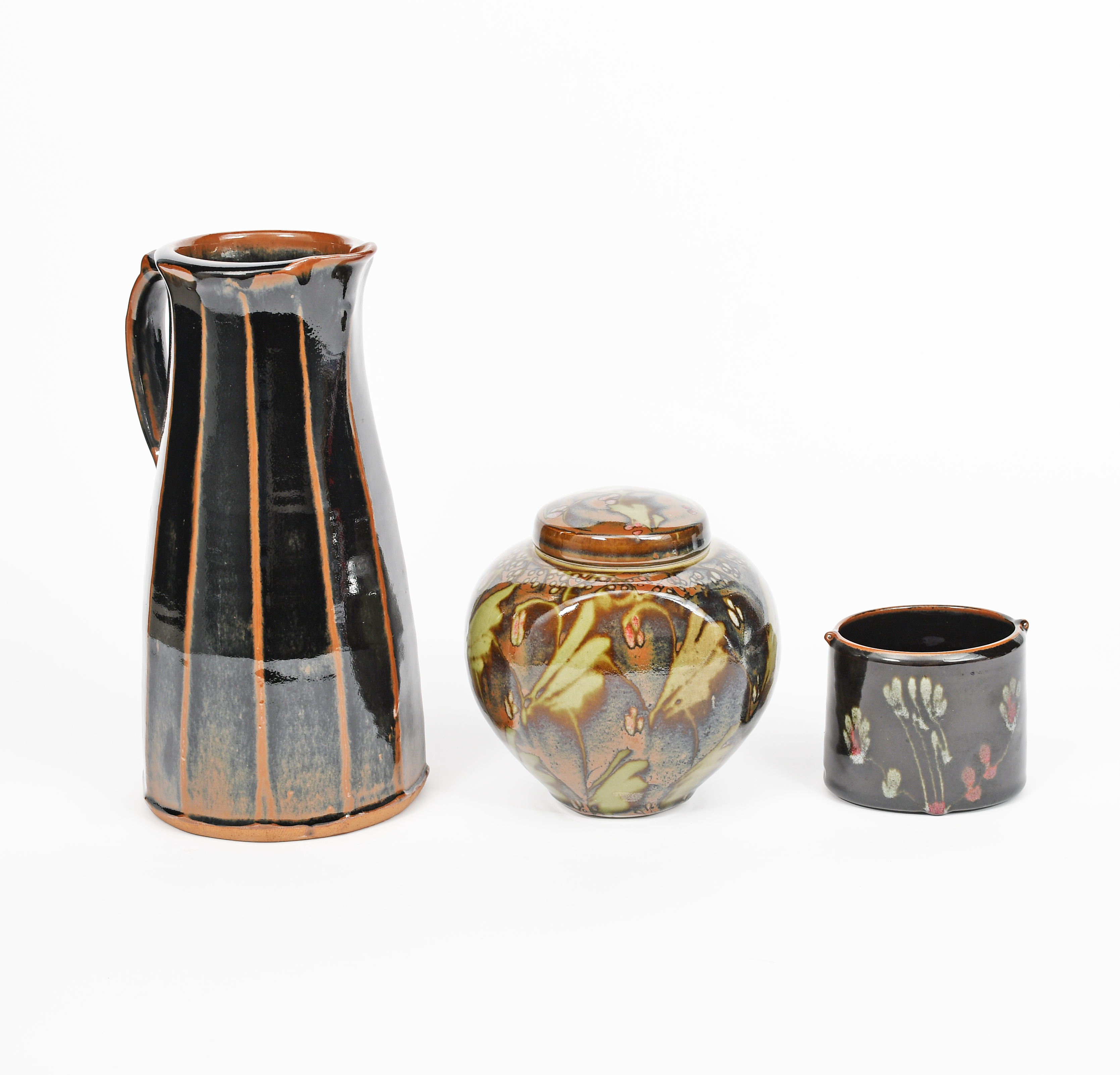 a cut-sided stoneware jug, covered in a tenmoku glaze to the foot, a ginger jar and cover painted with flowers and an elliptical pot with small loop handles painted with flower stems impressed seal marks, 33cm. high, (4)