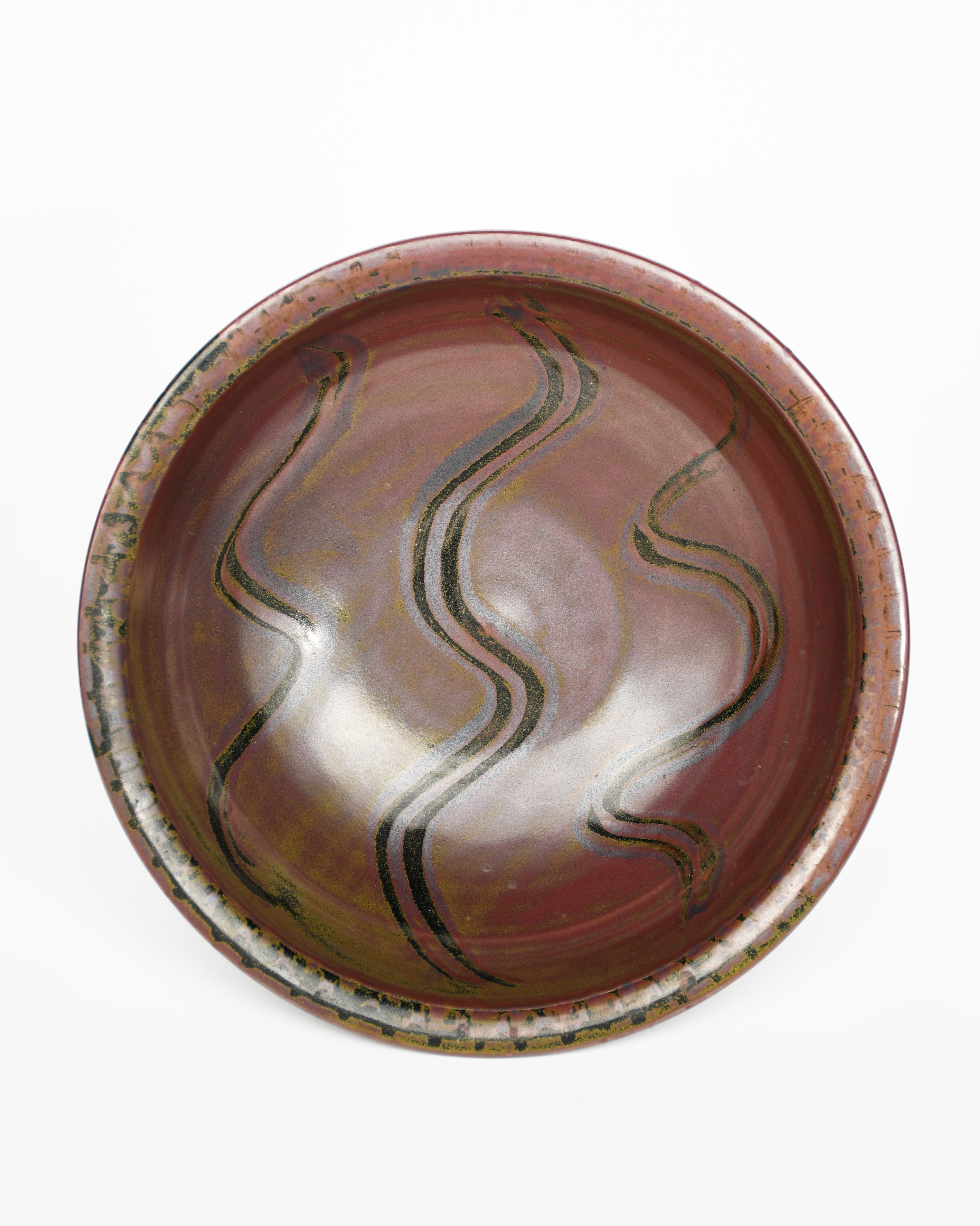 a large Winchcombe Pottery stoneware platter, circular form, covered in a brown glaze, with pulled ochre and blue geometric decoration to well and rim, another smaller and a Winchcombe Pottery bowl with combed decoration, and two large Andrew McGarva items, impressed seal mark to all three Winchcombe pieces, 43.5cm. diam. (5)