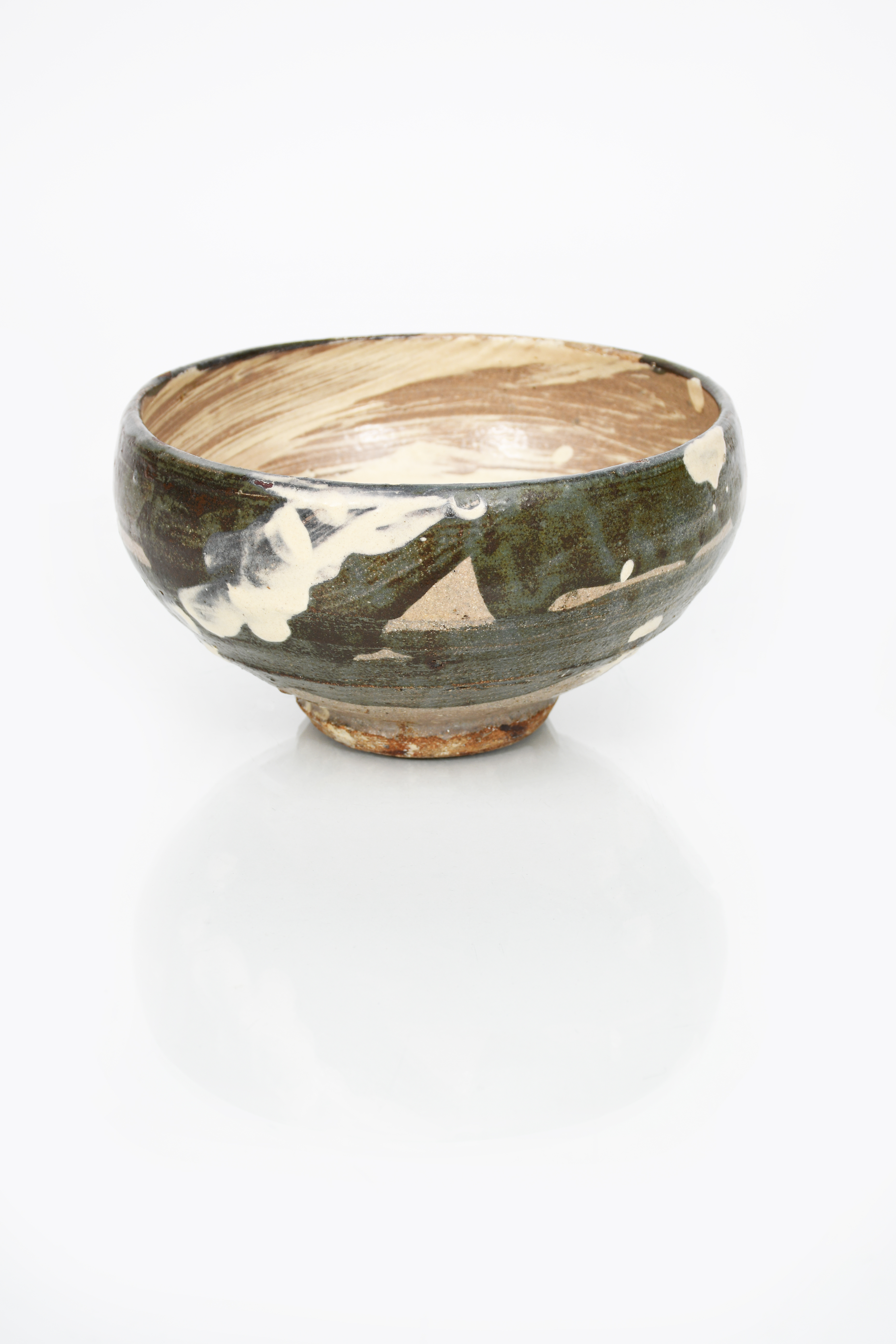 a stoneware footed bowl, the swollen body with brushed blue and grey slip decoration and white hakeme patches, impressed seal marks to base, minor glaze faults and loss to top rim, 20cm. diam.