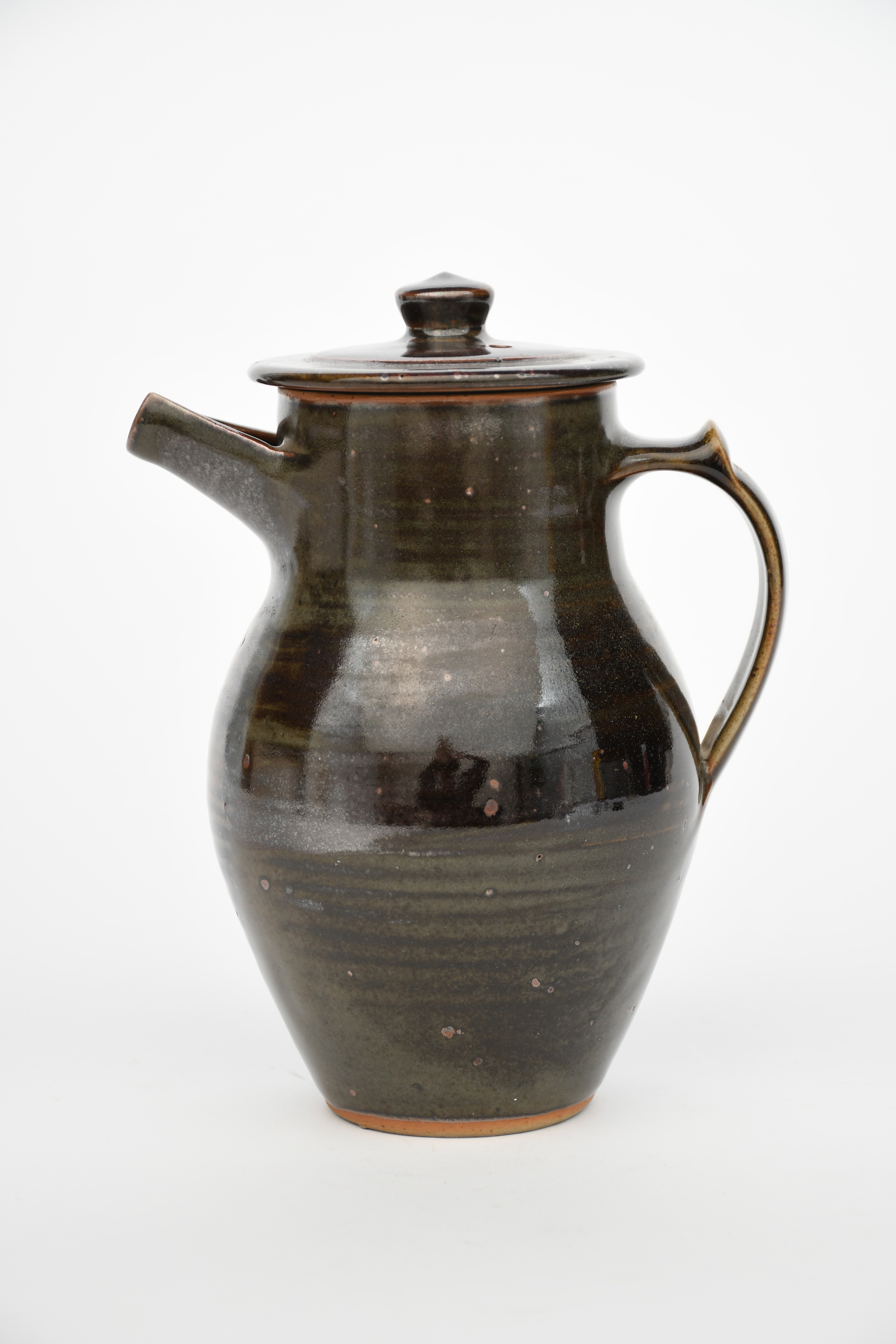 stoneware coffee pot and cover covered with a tenmoku glaze to the foot,