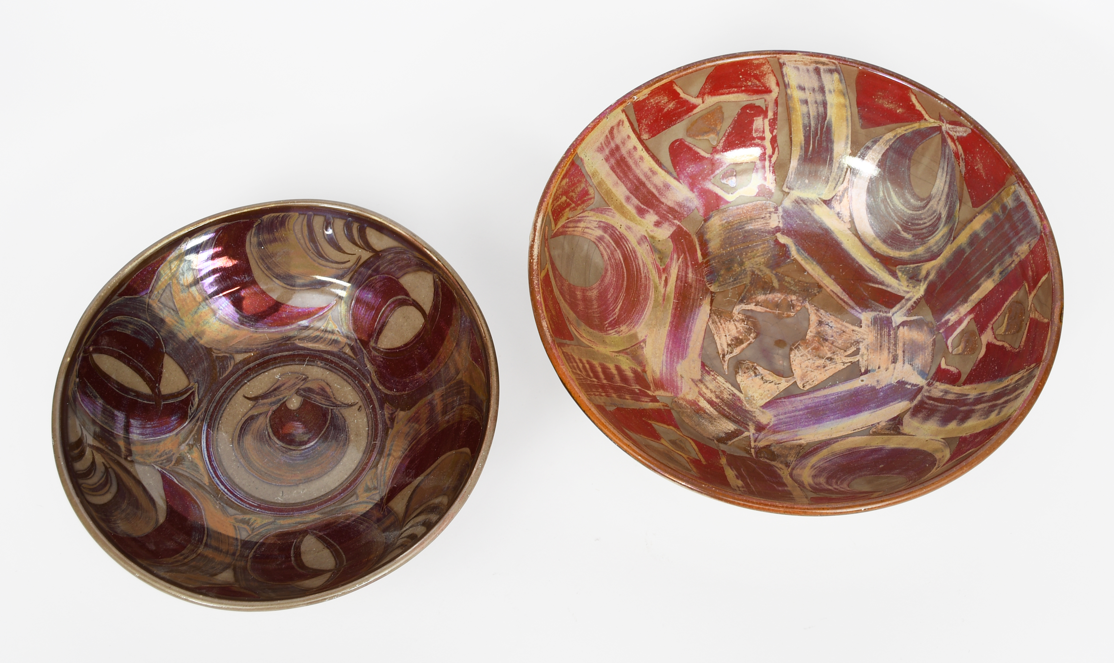 an Aldermaston Pottery tin-glazed bowl, footed form, painted to the interior in red and golden lustre, and another bowl smaller, painted marks, 25cm. diam. (2)