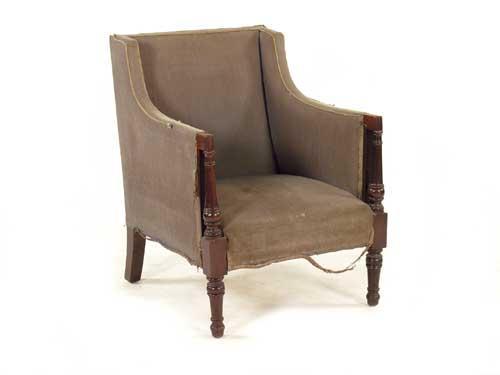 A William IV easy armchair, with mahogany turned supports and legs, previously on castors.