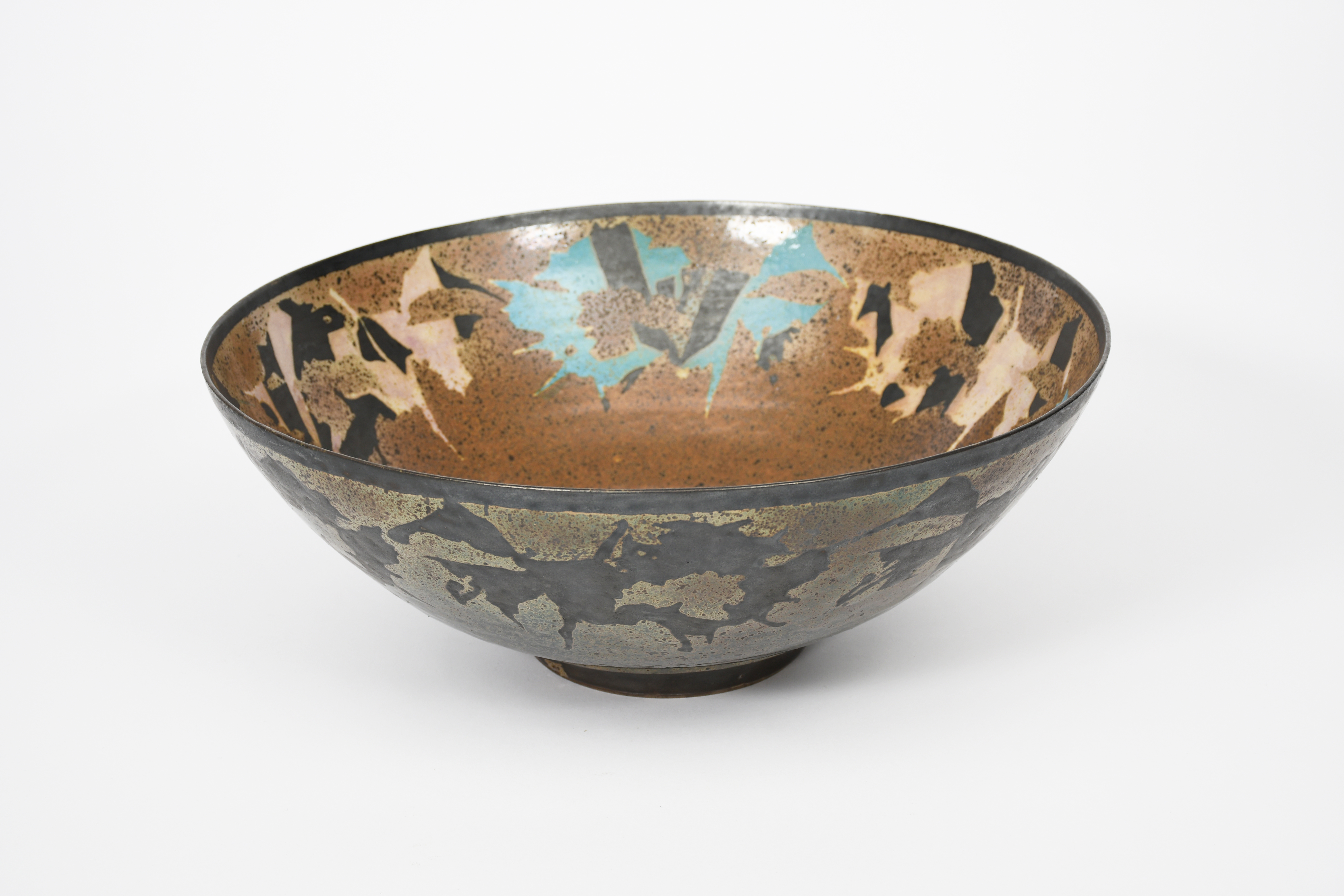 a large earthenware flaring bowl, on narrow foot, decorated with a geometric frieze in pink, blue and bronze on a speckled brown ground impressed seal mark, 39cm. diam.