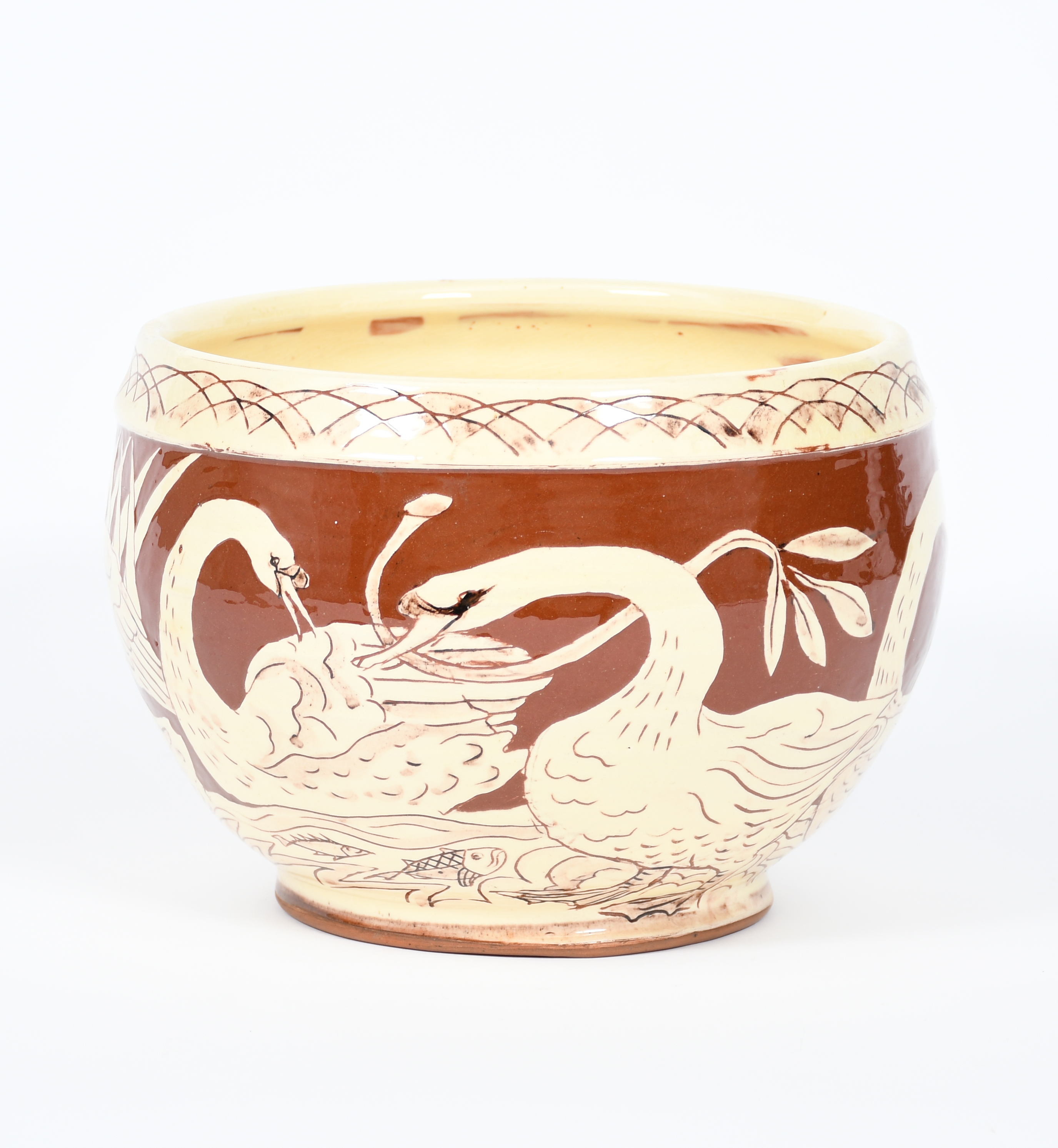 an earthenware bowl, decorated in low relief slip with a frieze of swans swimming and standing, the river with scaly fish swimming, in cream on a terracotta ground, incised MW monogram,