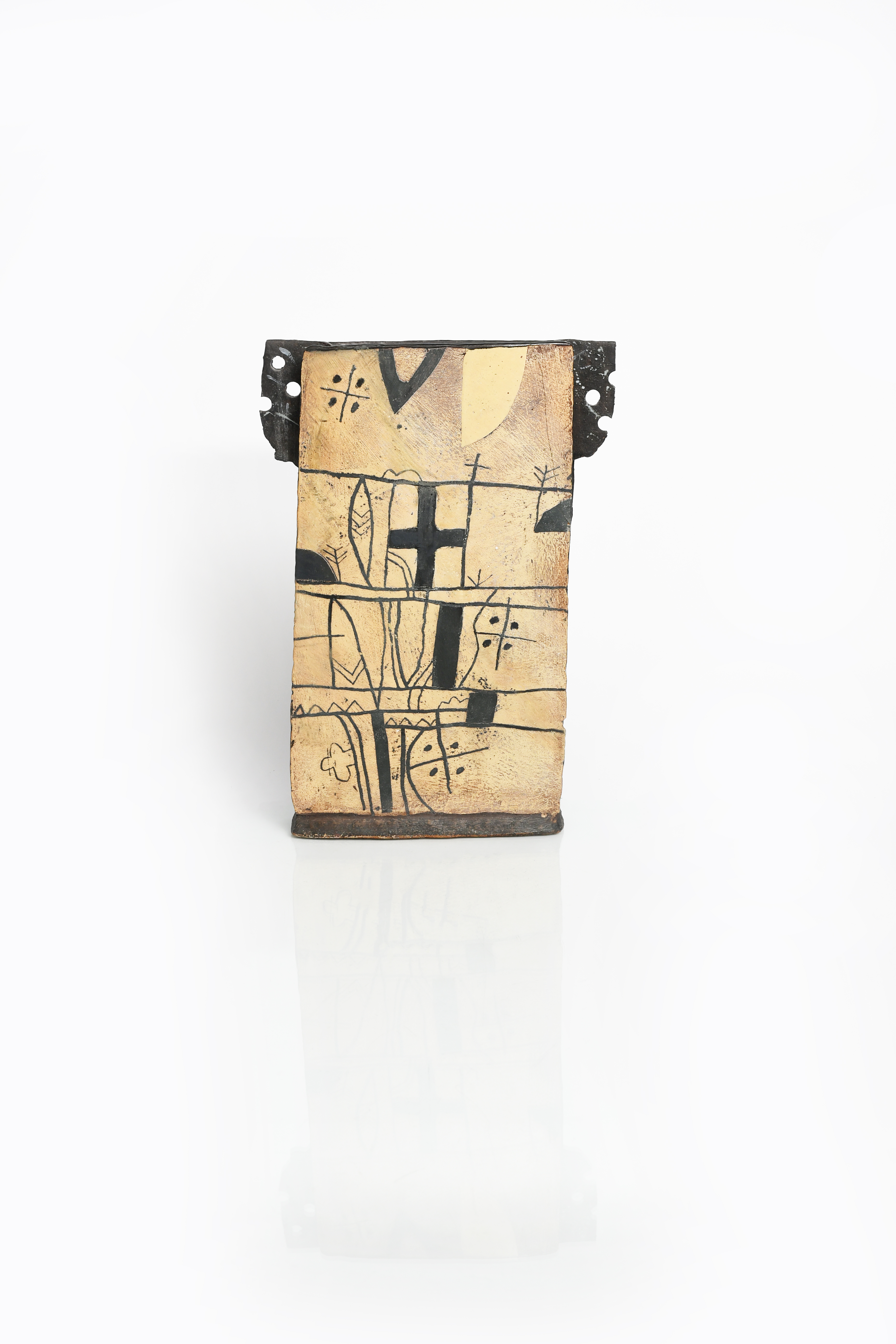 an early stoneware slab built twin-handled vase, painted with an abstract tree and cross design in black on a tan ground, the sides and back black with blue splashed design,