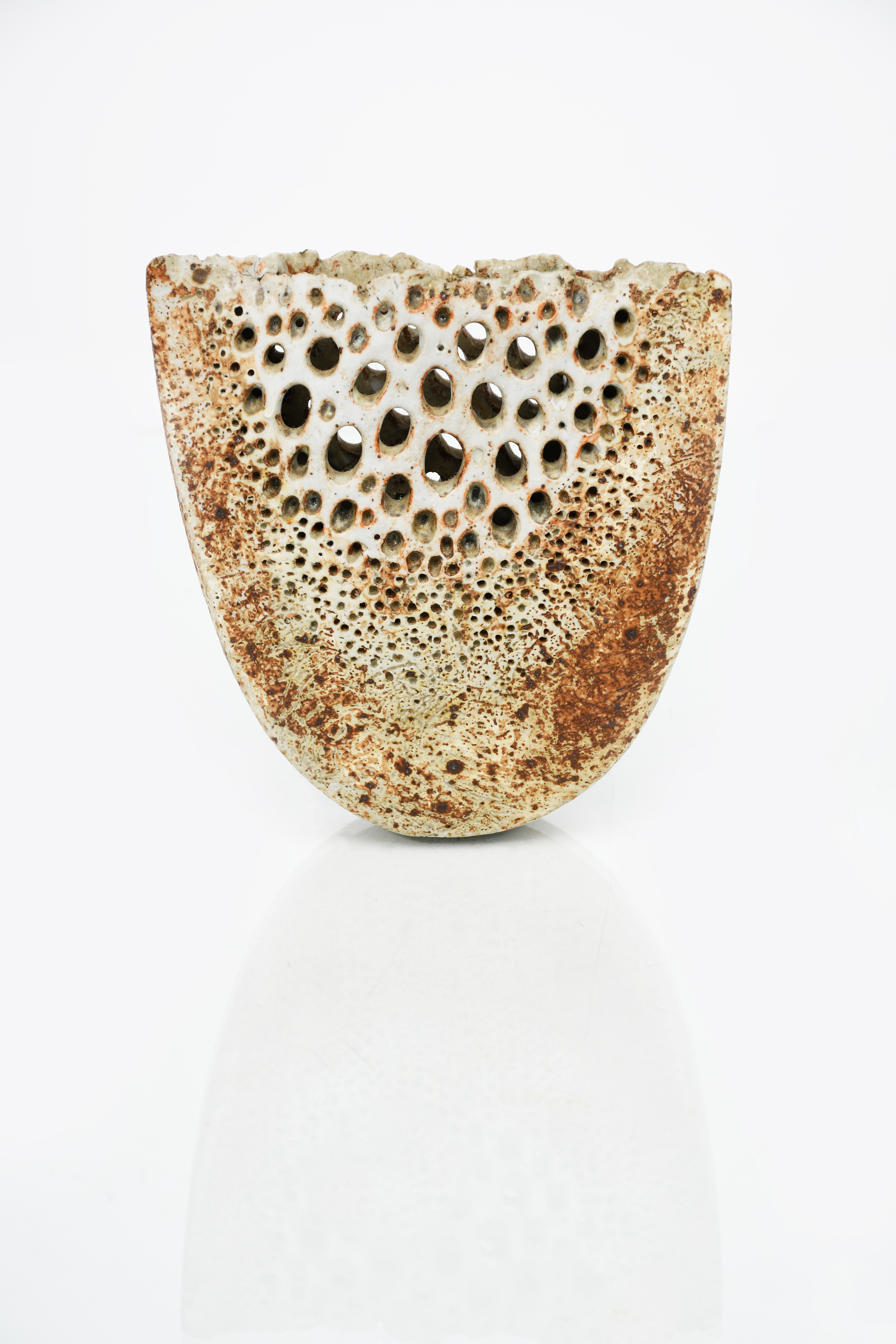 a stoneware segment vase, slender elliptical form with pierced decoration, glazed silver-grey and ochre incised AW, 15.5cm. high