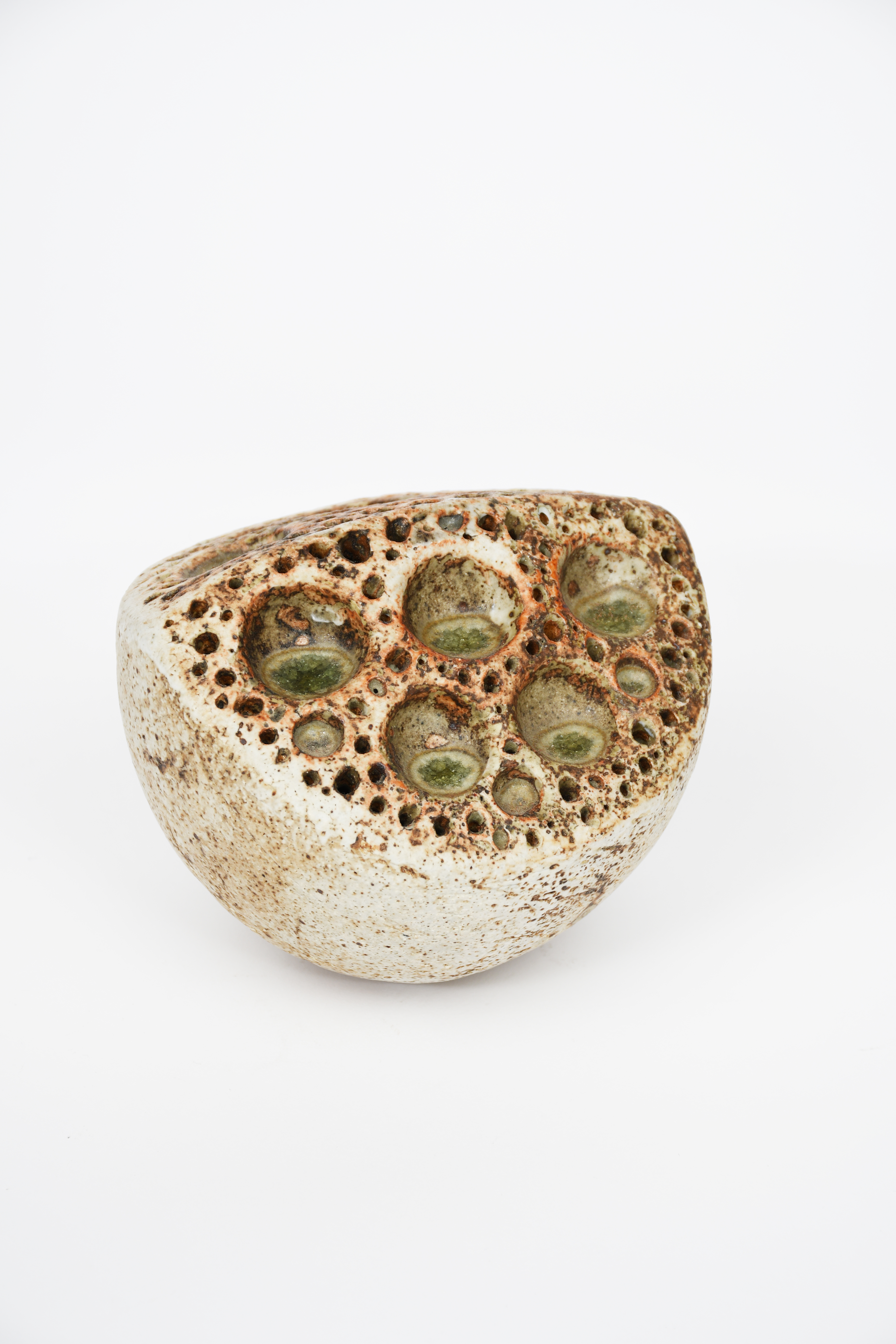 a stoneware vase, ovoid glazed in shades of ochre and silver grey, the crater top with pooled glaze incised AW, 12.5cm. high