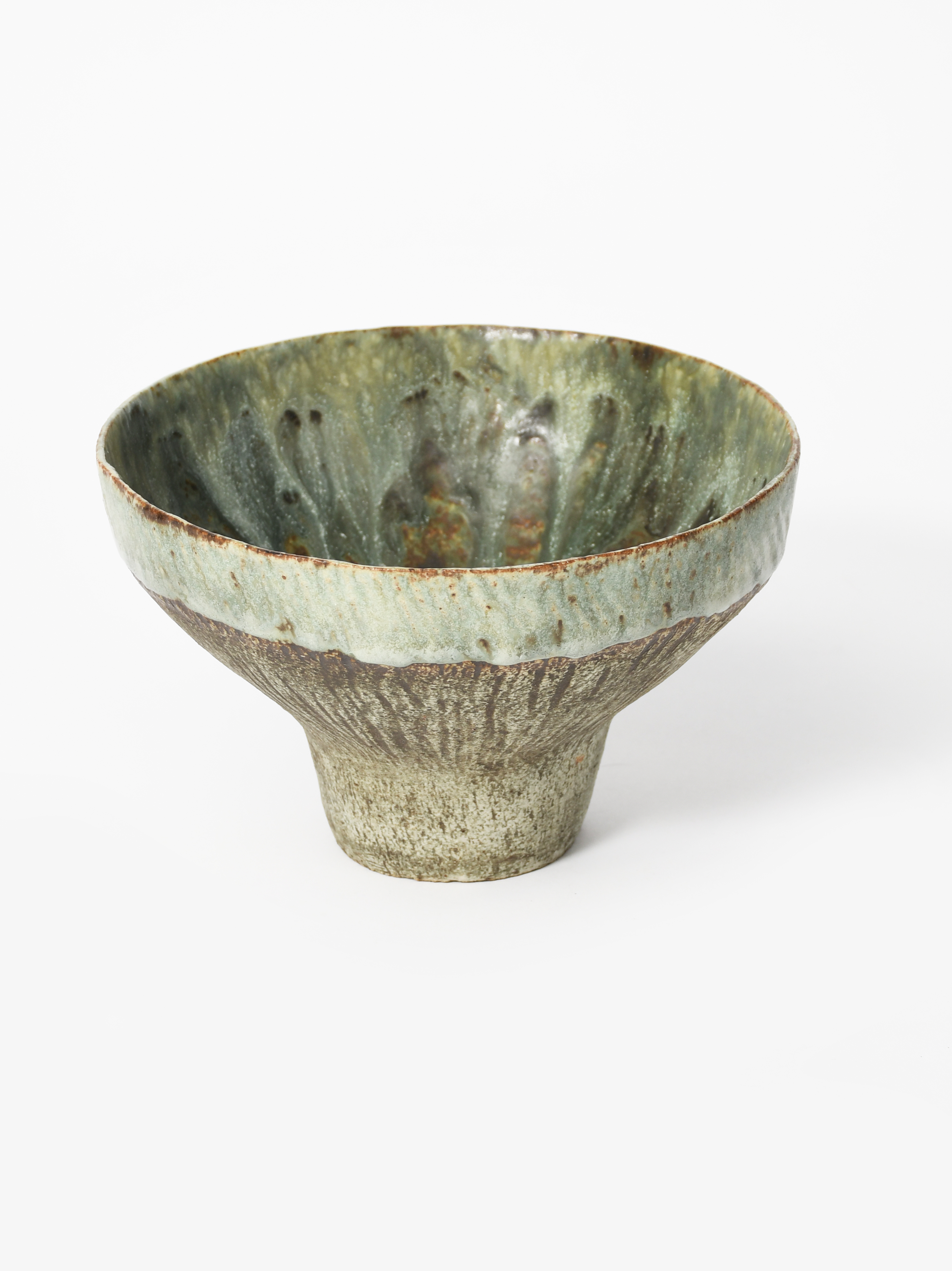 a stoneware footed vase, incised decoration, covered with a running green on a mottled brown ground impressed seal mark, 13cm. high, 20.5cm. diam.