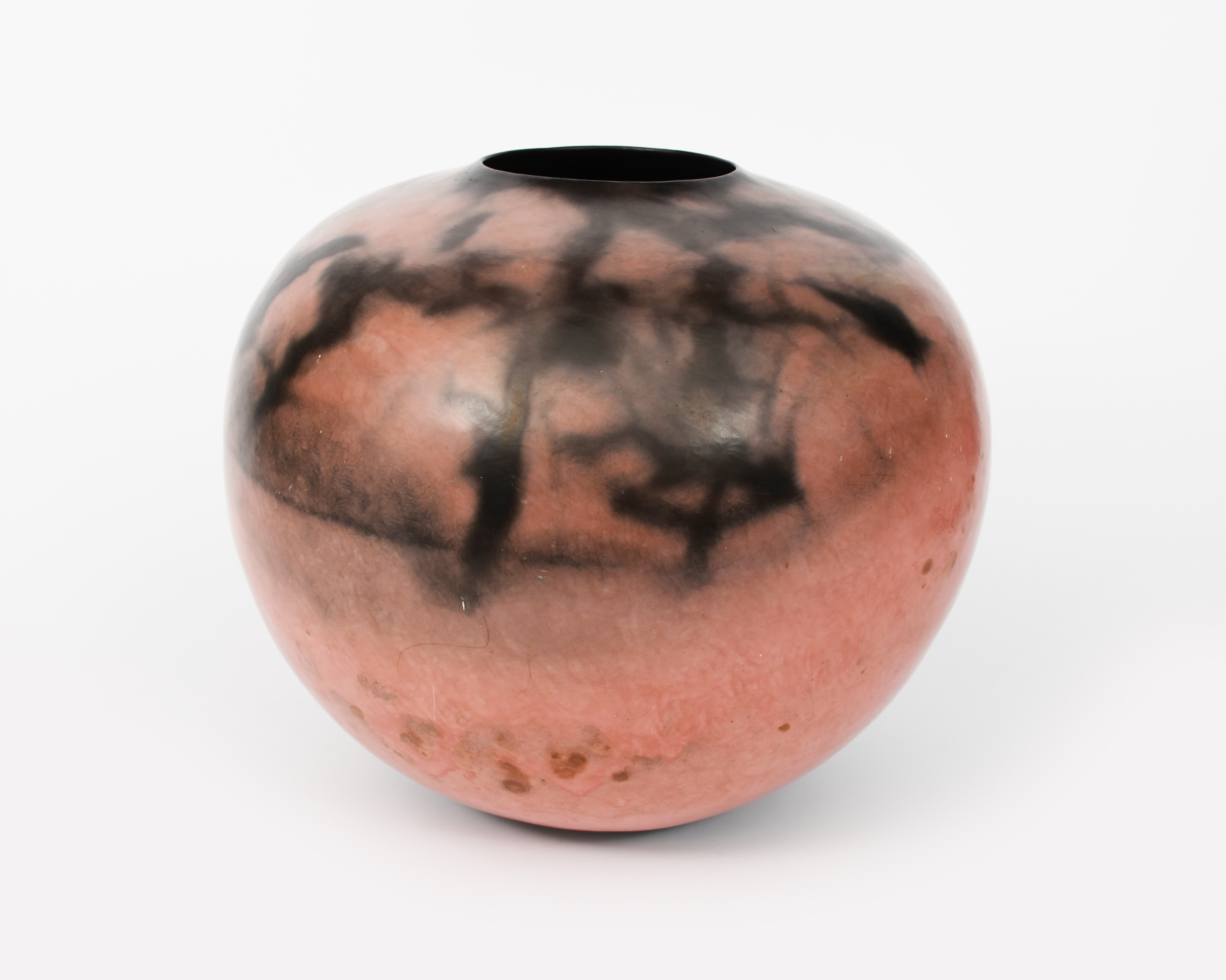 a large ovoid burnished coiled vase, the surface covered in a pink slip and burnished, incised signature, 36cm. high