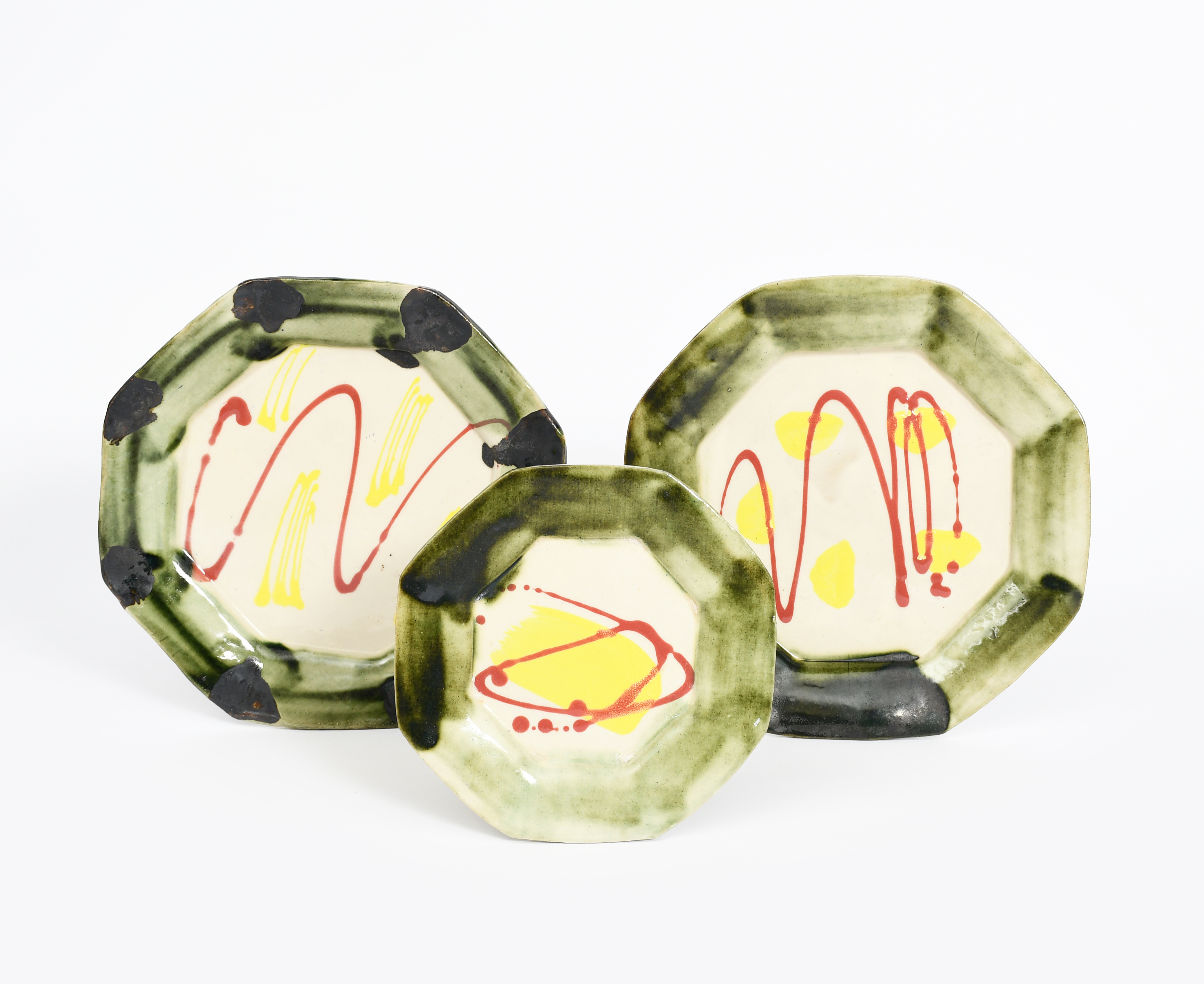 three earthenware octagonal plates, each decorated with red and yellow painted design inside green border to rim, comprising two large and one small plate incised signatures, 26.5cm. diam (largest), (3)