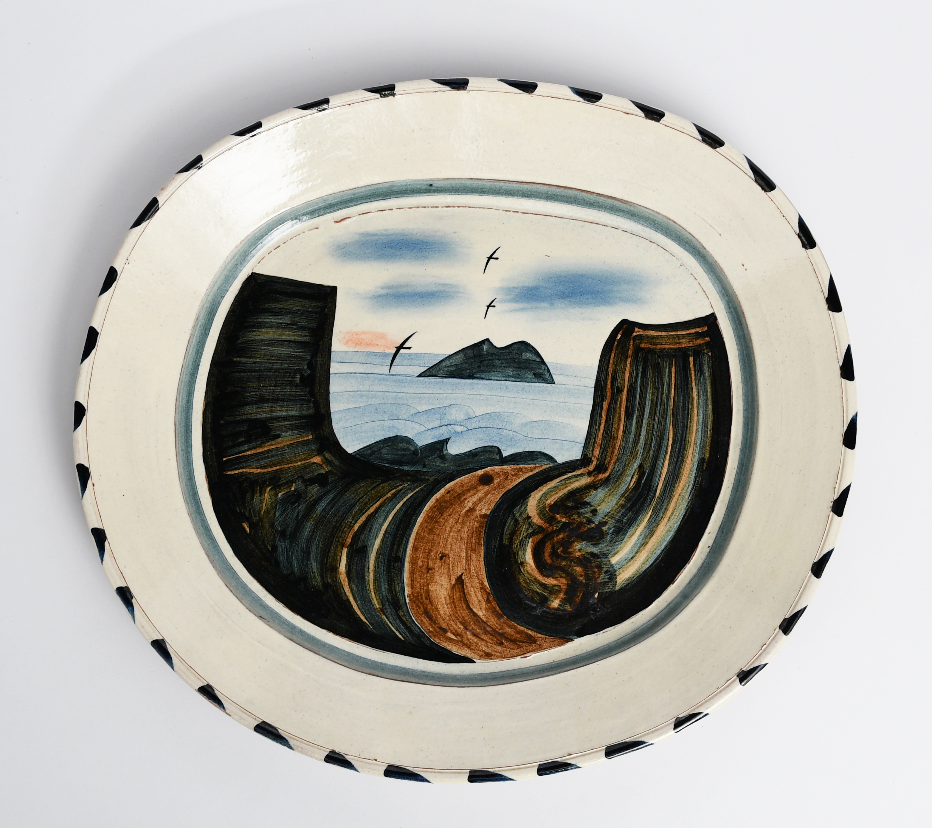 an earthenware charger, dated 1997, painted with three sea birds flying above a coastal cliff landscape, in colours, incised Campbell 97-1,