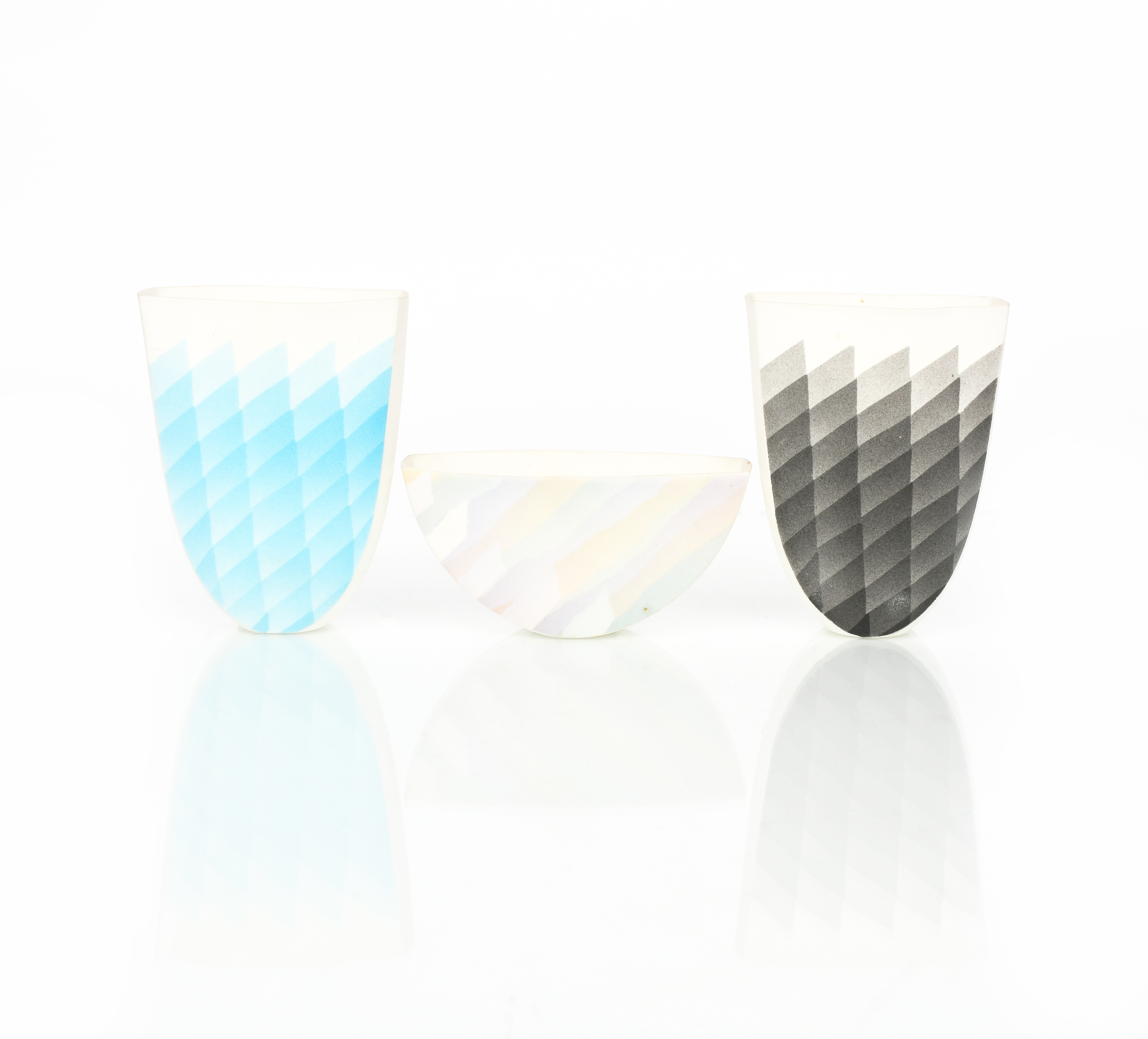 a flaring porcelain vase, 1986, rectangular section, spray glazed in graduated grey to back, another similar glazed in graduated tones of blue, and another smaller glazed in pink, yellow and grey incised monogram and dates to all three, 12cm. high (3)