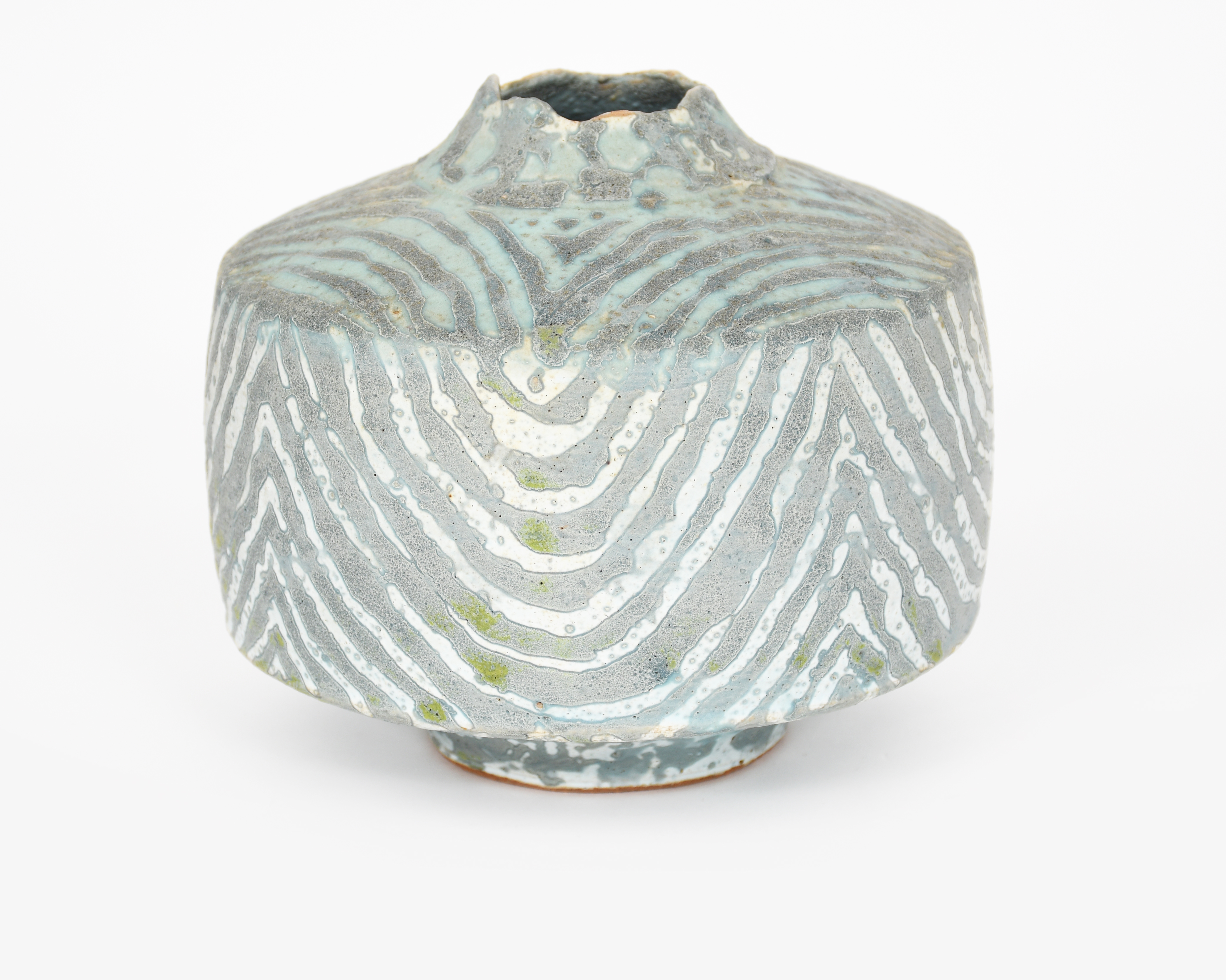 a stoneware vase, shouldered form with narrow neck, inlaid with blue and white chevron glaze design, impressed PFB seal mark, 14cm. high