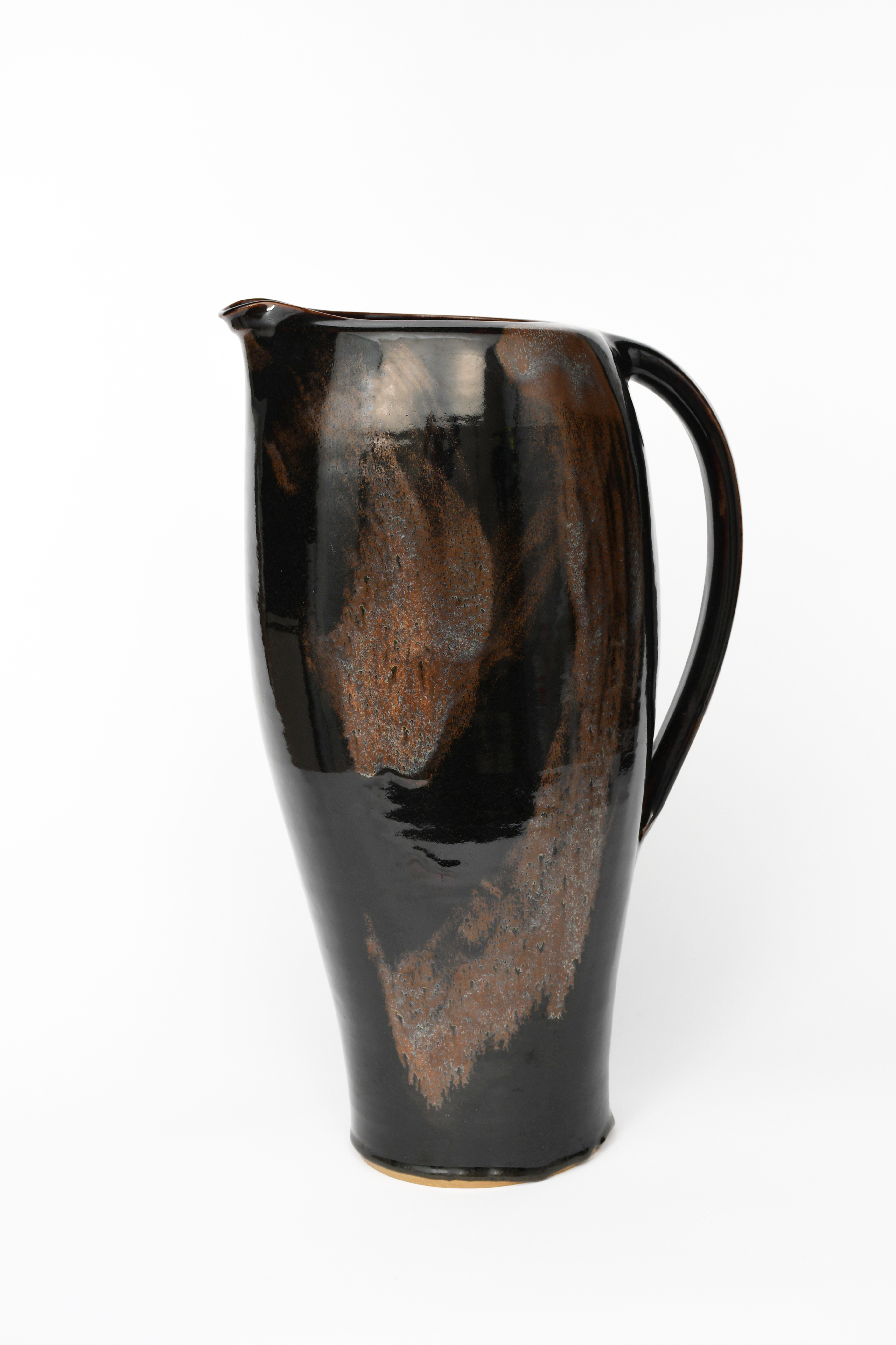 a massive stoneware ewer, slender swollen form, covered in a tenmoku glaze to the foot, with brushed decoration, impressed seal mark, 56cm. high
