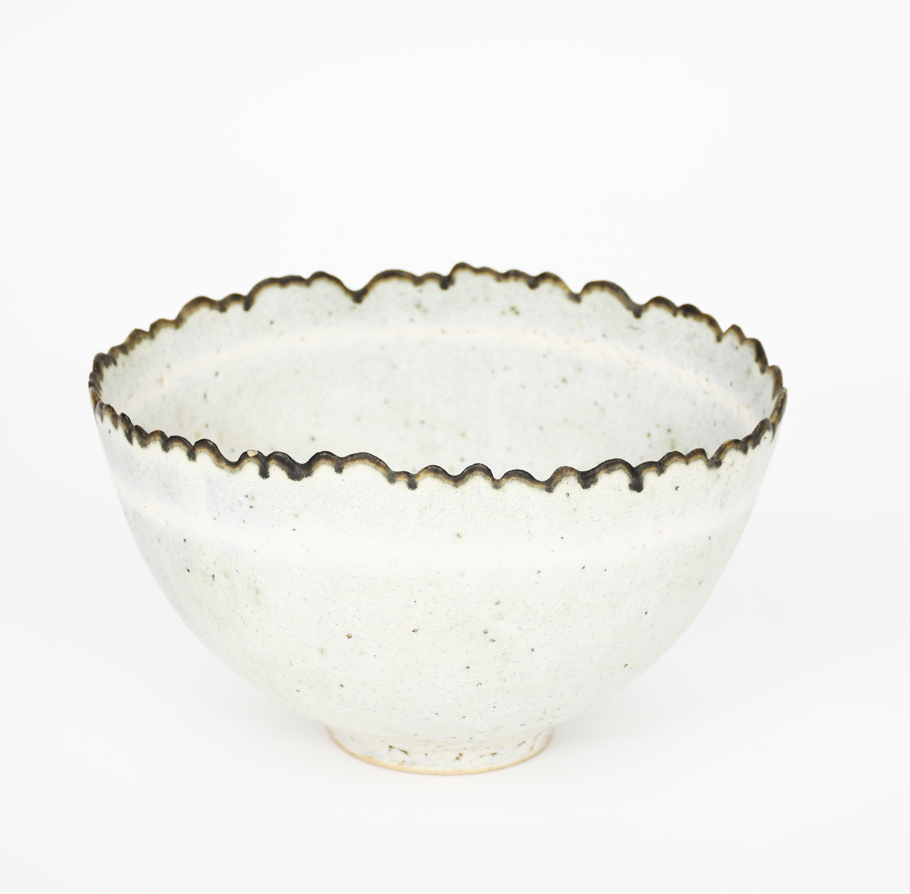 a squeezed stoneware footed bowl, covered in a pitted pale blue glaze with white lines and manganese fluted top rim, impressed MAR seal mark, small glaze nick to top rim, 13cm. high, 21.5cm wide.