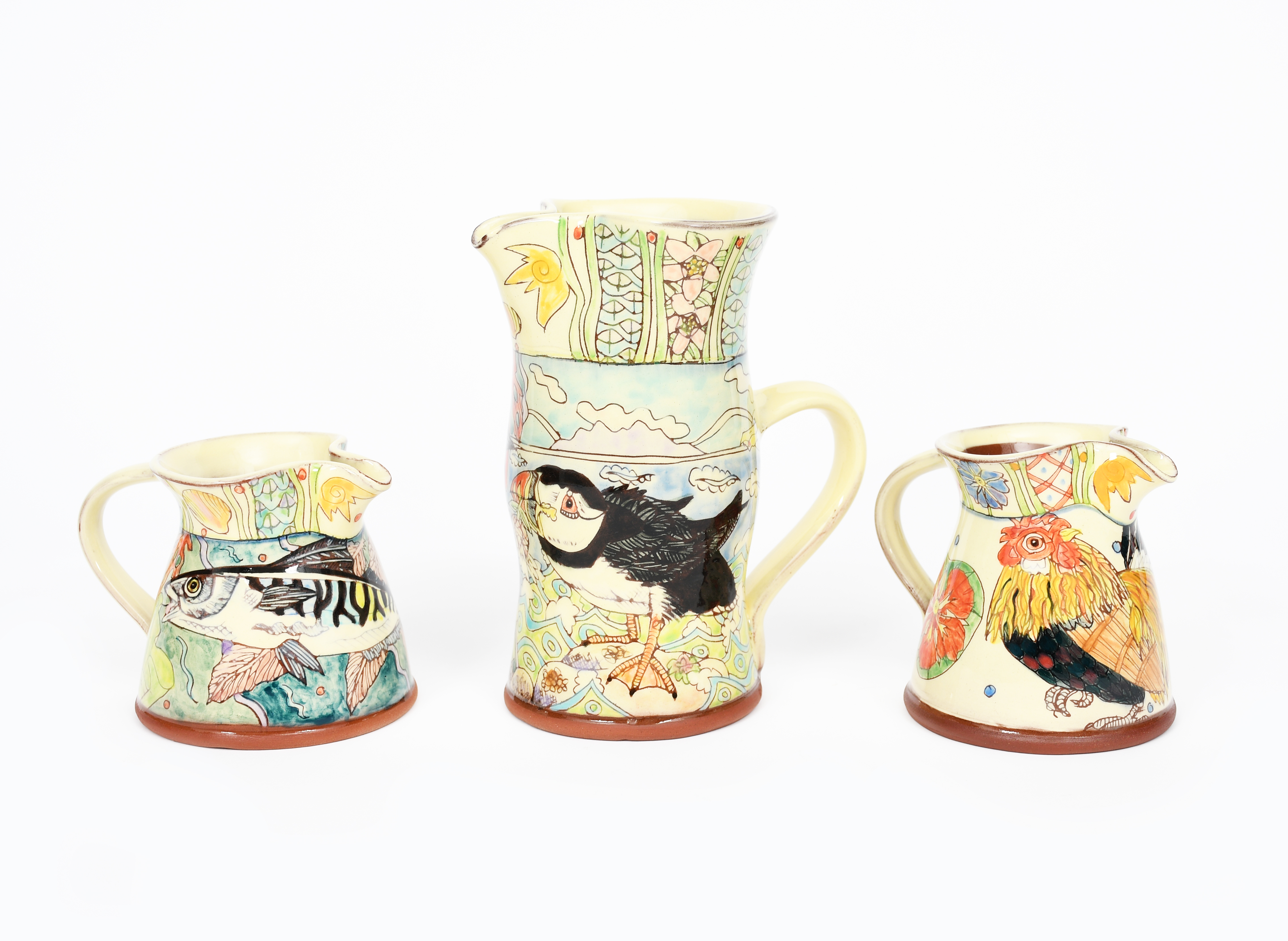 a slender, swollen jug, painted with a puffin and a herring, in colours, and two smaller jugs by Maureen Minchin painted with a herring and a cockerel, impressed seal mark, 17cm. high, (3)