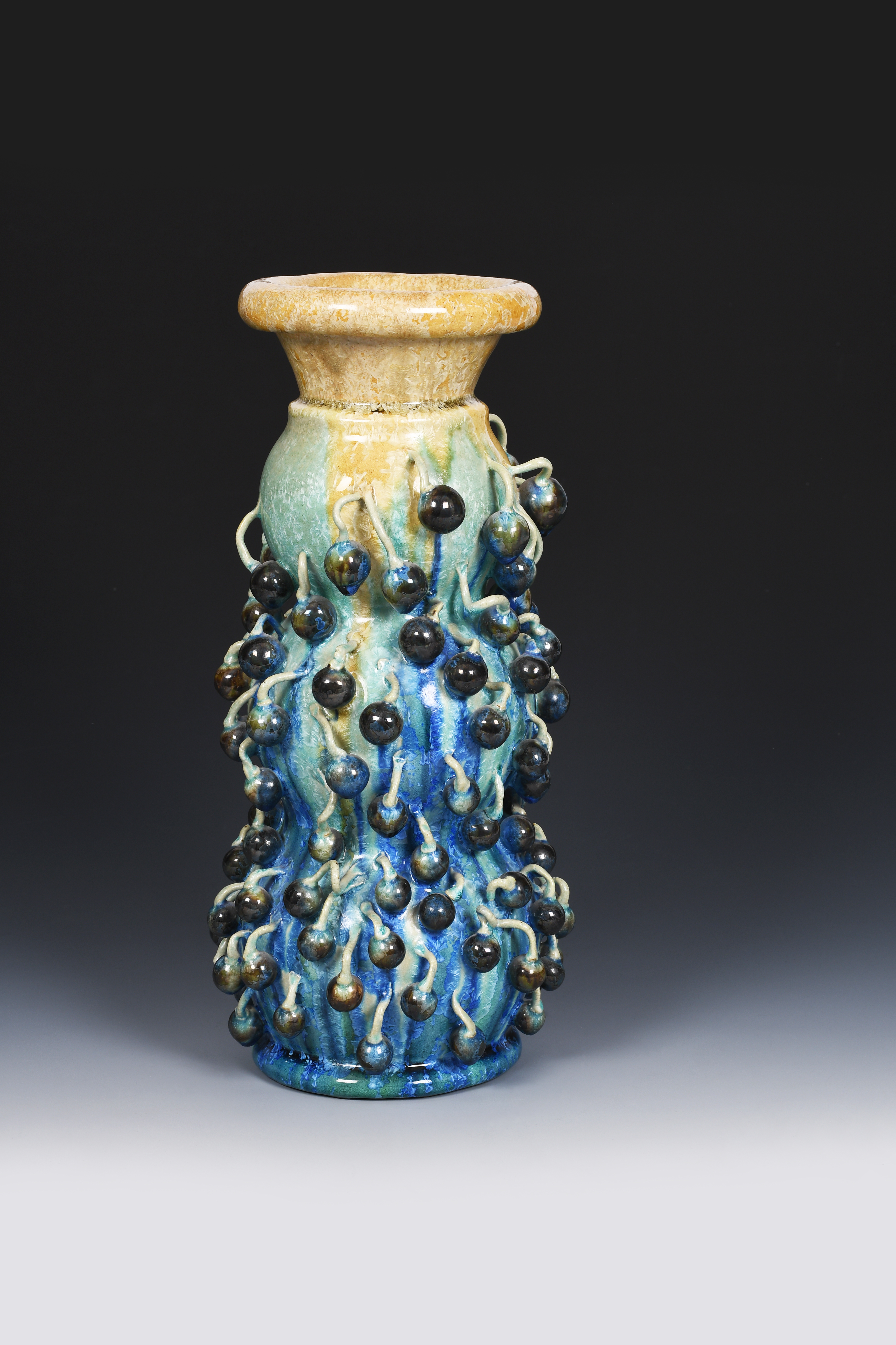 a tall coiled and hand-built stoneware vase with applied berries, crystalline glazed in blue, turquoise and yellow,