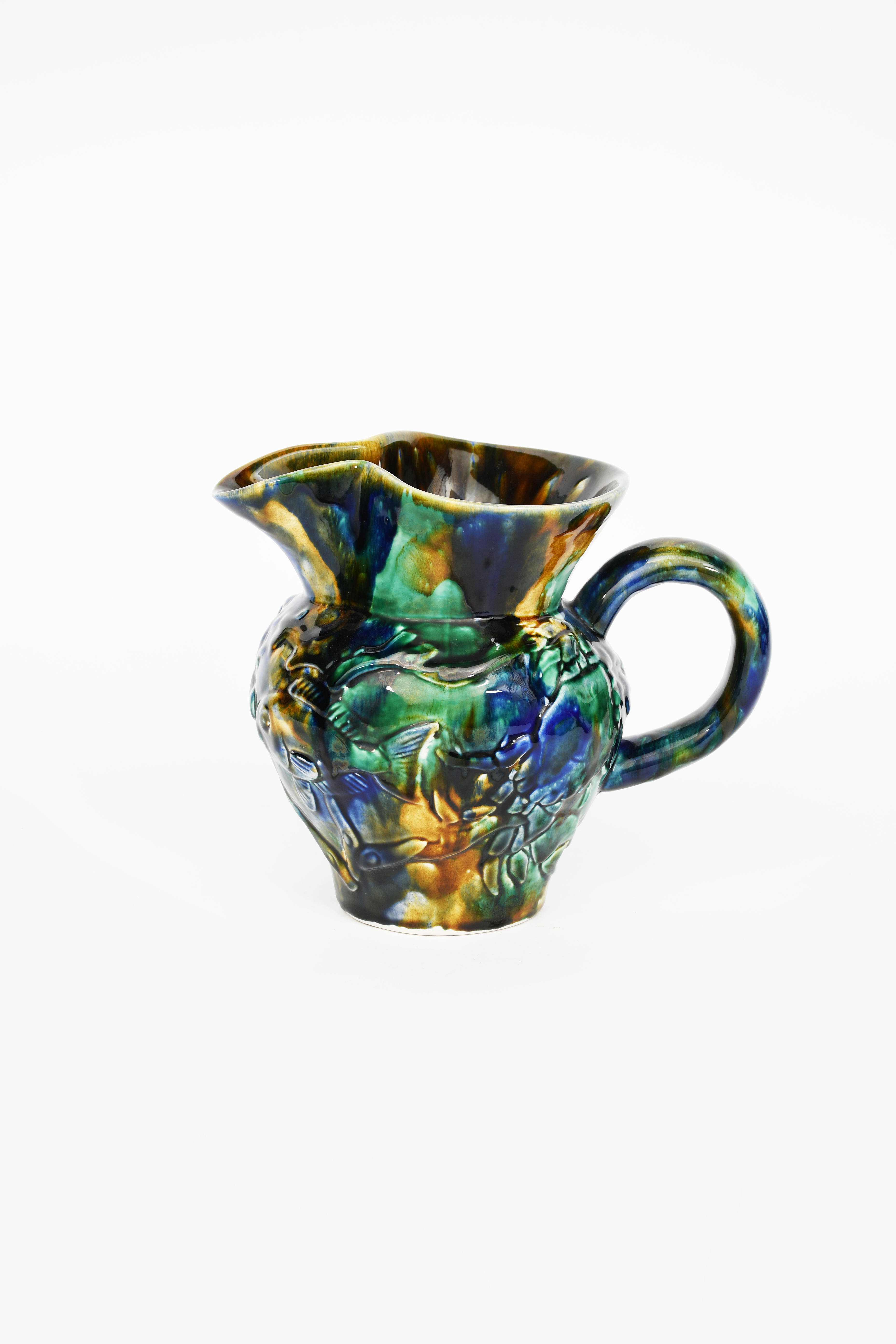 a large jug made in limited but not numbered run of approximately fifty, circa 1986, retailed by James Kent, modelled in low relief and covered in a streaked blue and green glaze,