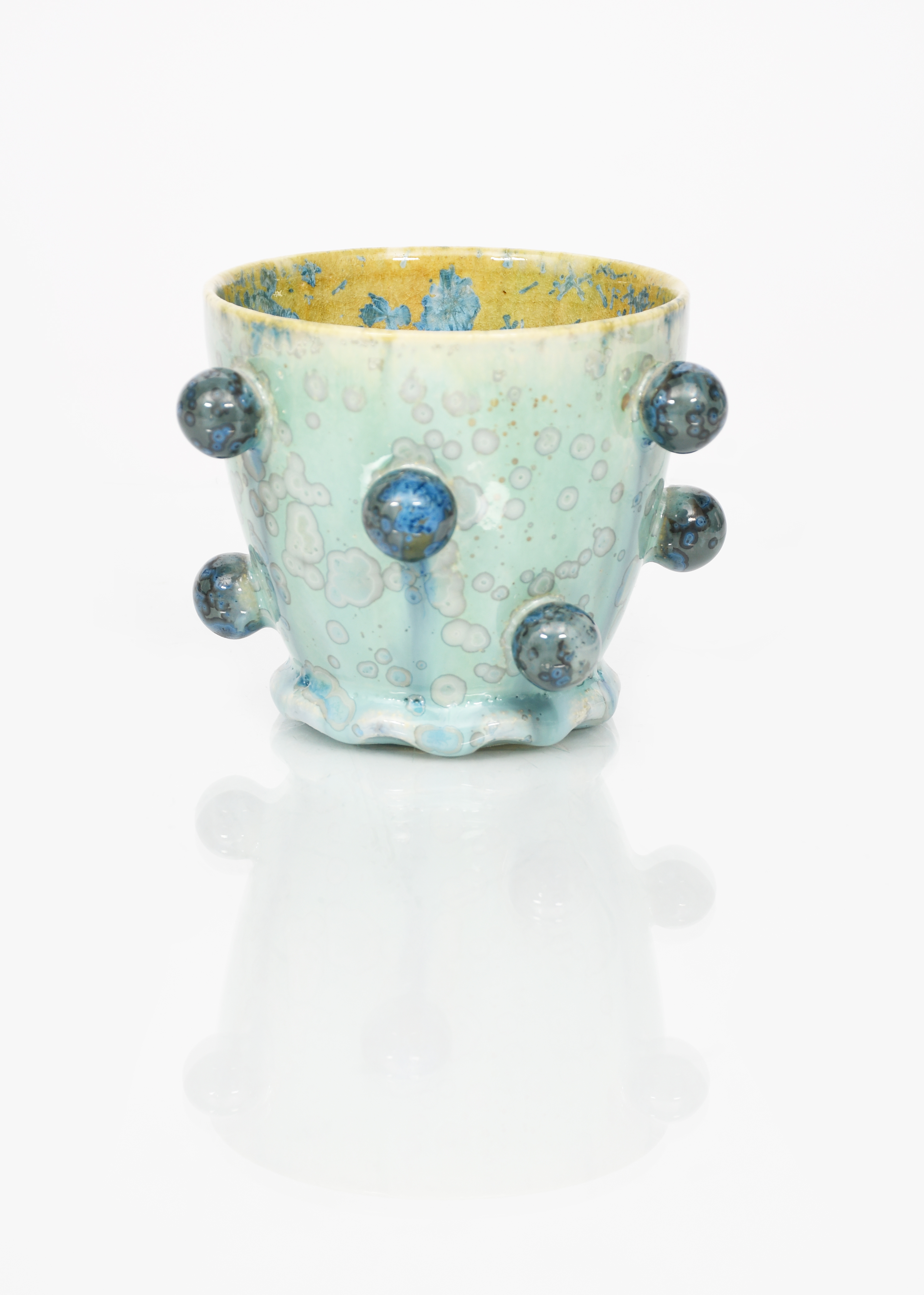 a crystalline glazed stoneware vase, dated 2013, flaring conical form with applied ball decoration, glazed yellow and pale blue