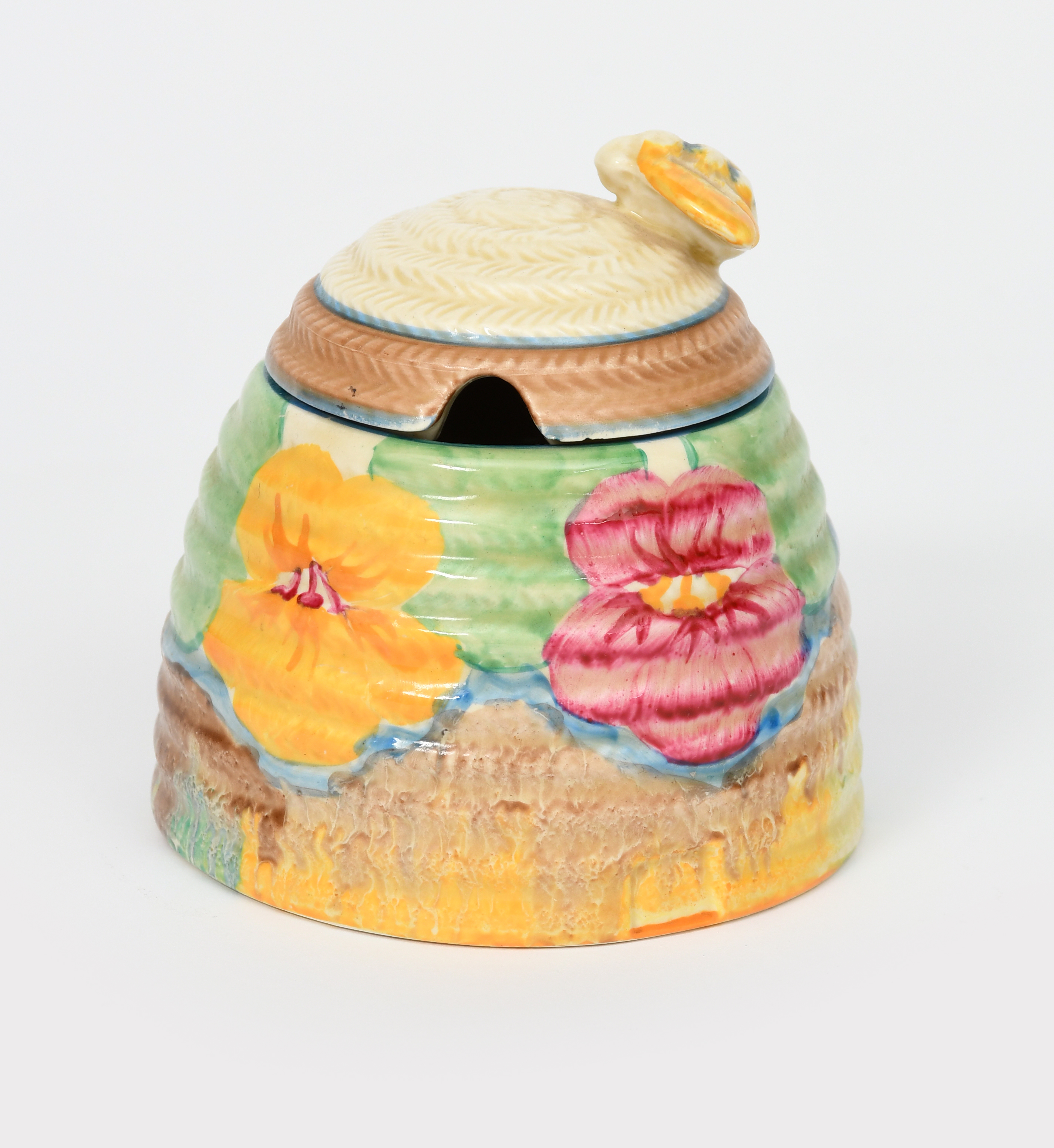 'Delecia Pansies' a Clarice Cliff Beehive Honeypot and cover