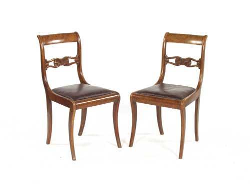 A set of five 19th century continental mahogany side chairs, with drop in seats and on sabre legs.