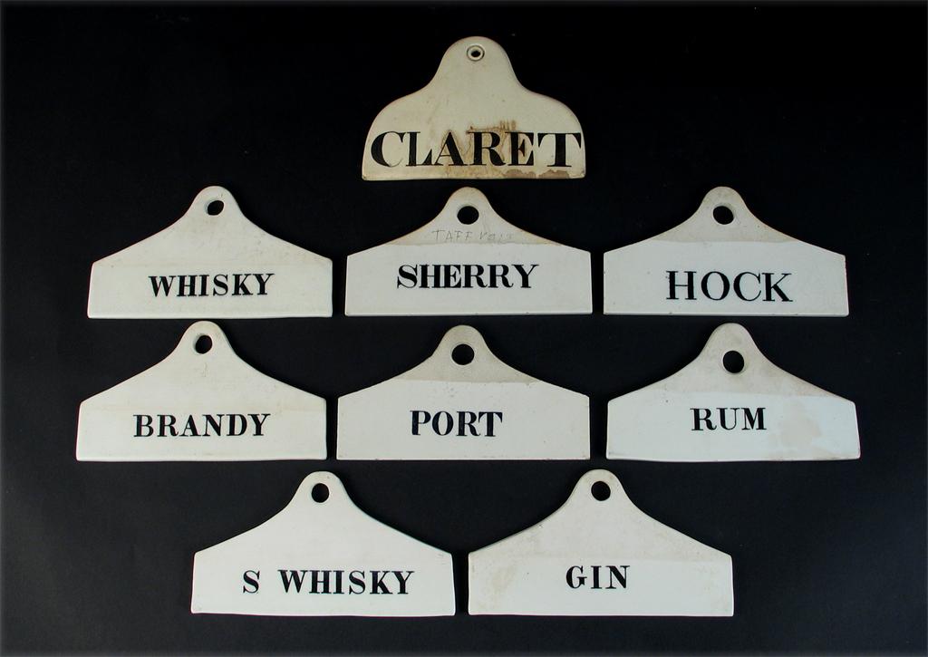 A collection of nine ceramic bin labels, inscribed: Brandy, Claret, Gin, Hock, Port, Rum, Sherry, S Whisky and Whisky, three with impressed marks, two for Farrow and Jackson and one for Burrow, 14cm. (9)