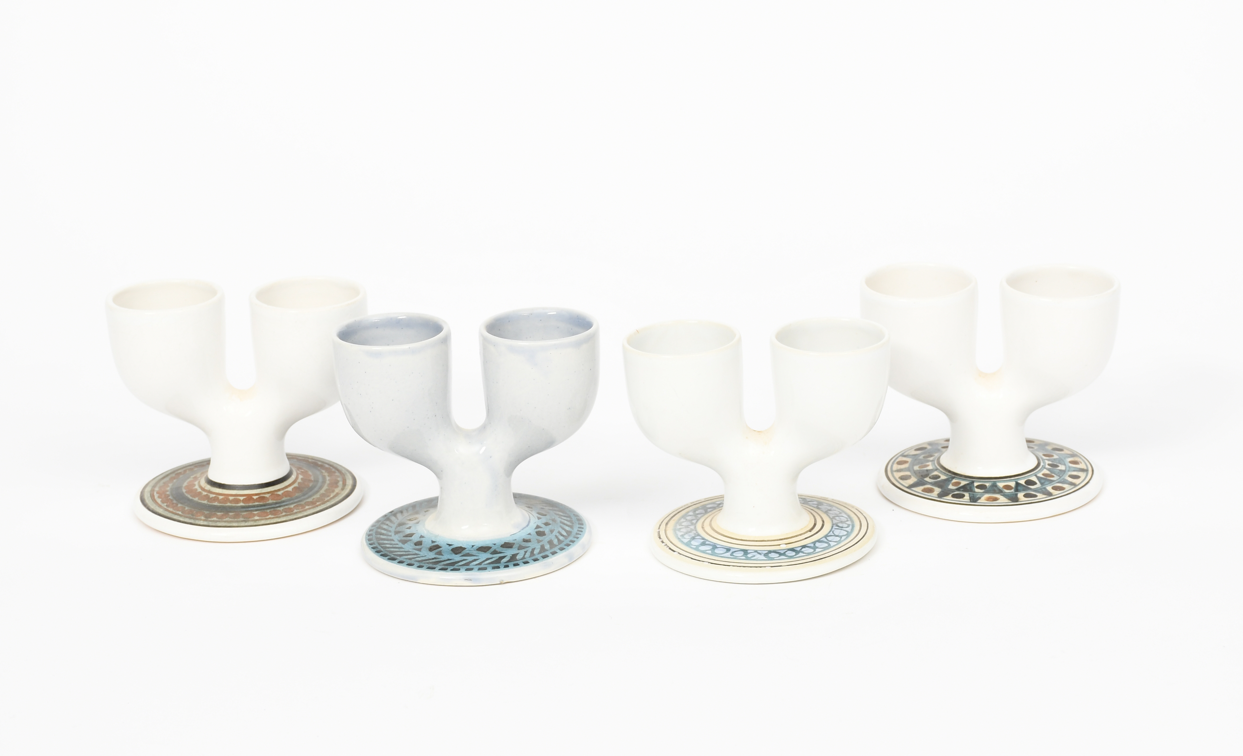 Four Troika Pottery Double Egg Cups, each resist decorated to the foot in blue, black and ochre on a white ground, painted Troika marks and artist monograms, 11cm. wide, (4)