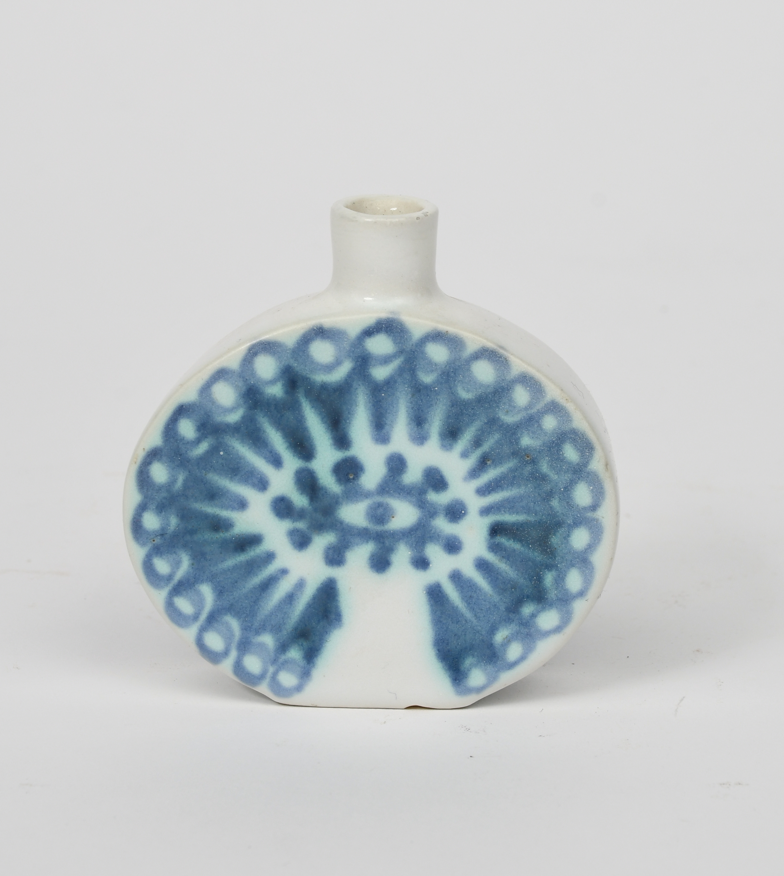 A Troika Pottery Perfume Bottle, disc form with solifleur neck, painted with geometric design in blue to one side on a white ground, painted Troika St Ives to base, professionally restored neck, 6.5cm. high