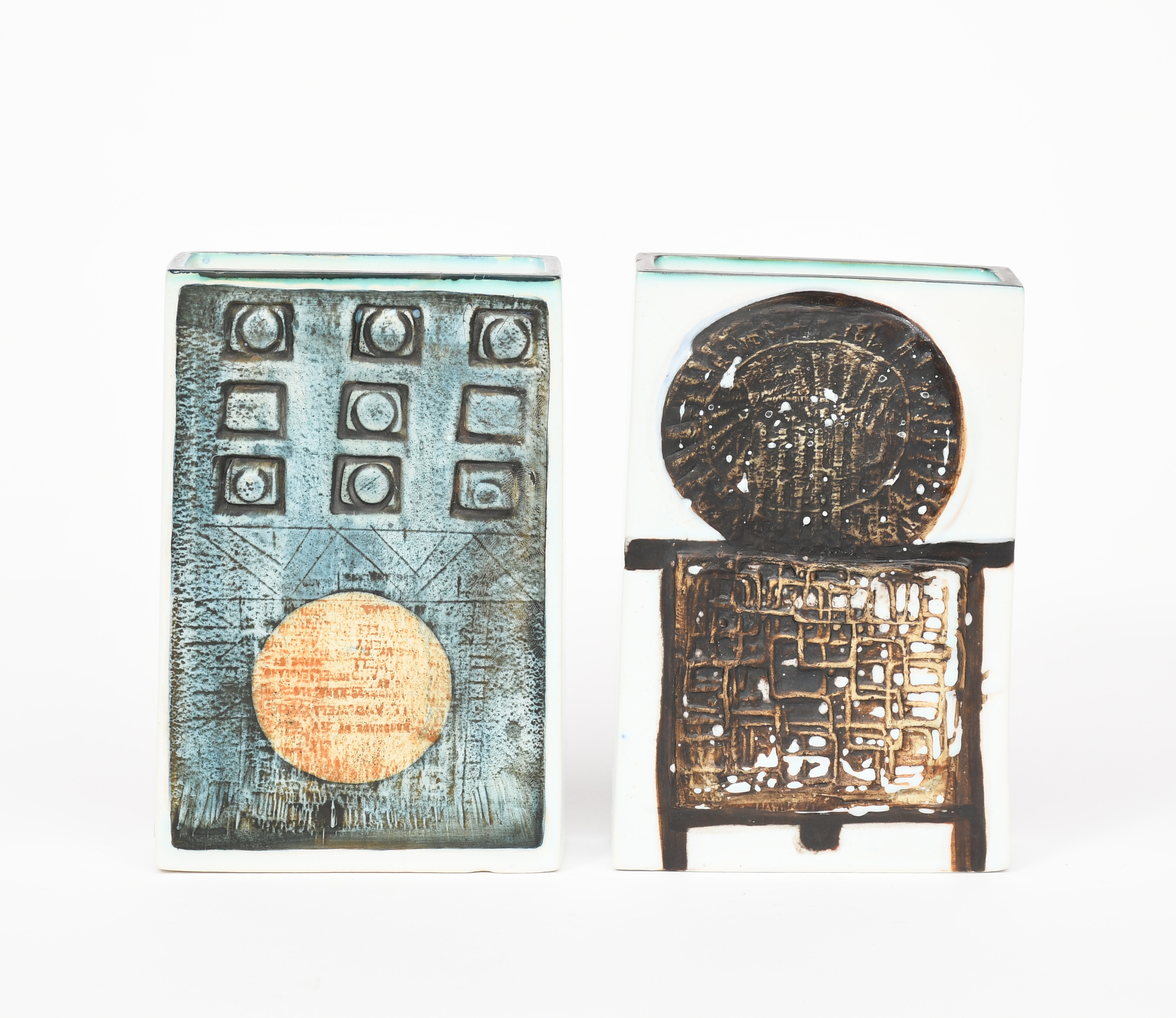 A Troika Pottery vase, rectangular modelled in low relief with a stylised figure glazed black on a white ground, the reverse a geometric design in brown, green and white, and another similar decorated with keypad design, painted Troika St Ives England, Trident mark and indistinct artist monogram, main vase professionally restored, 167cm. high, (2)