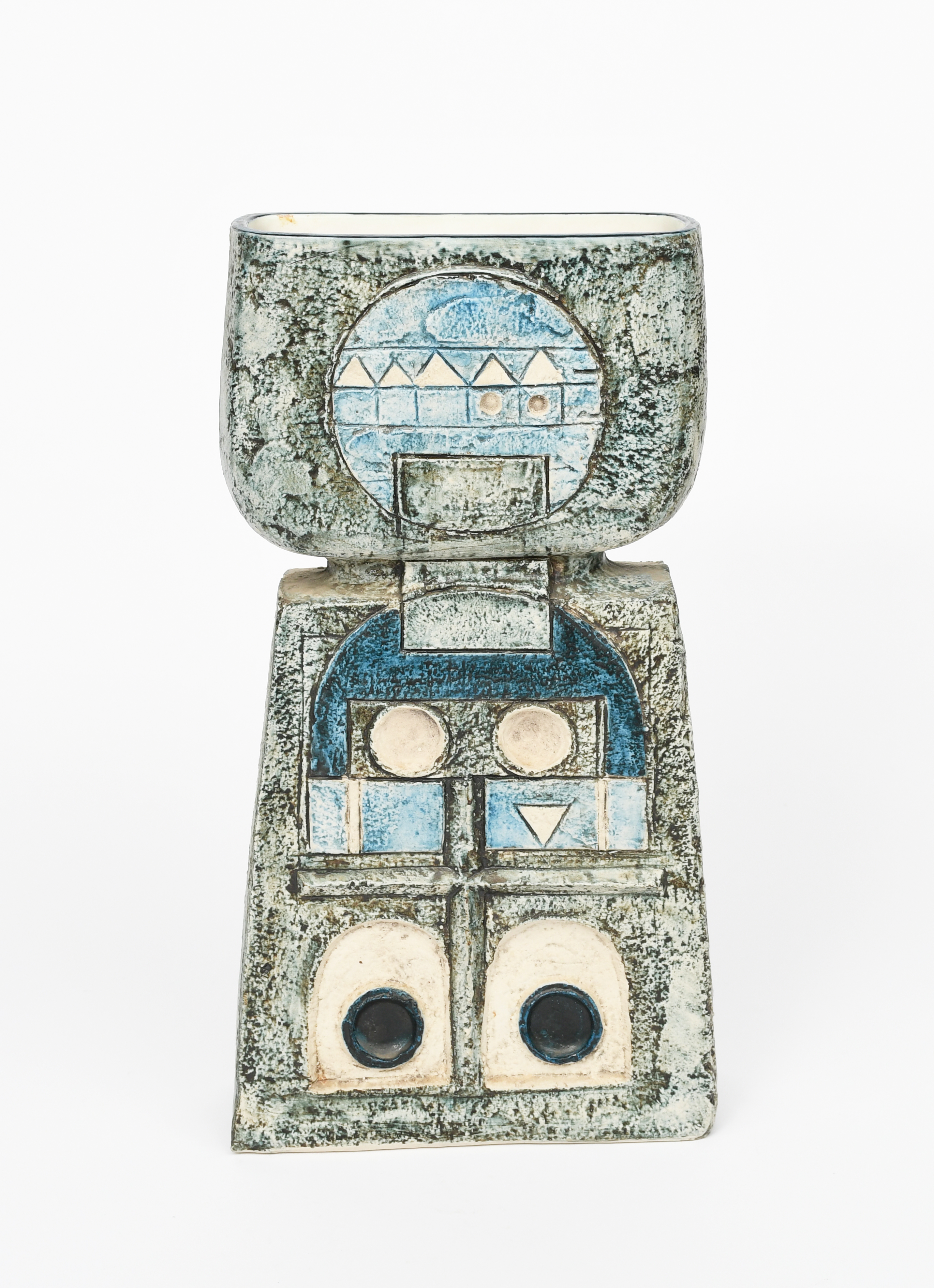 A Troika Pottery Double Base vase by Louise Jinks, cast in low relief with a stylised figure to each side in blue, green and buff painted Troika Cornwall, LJ monogram, 35.5cm. high