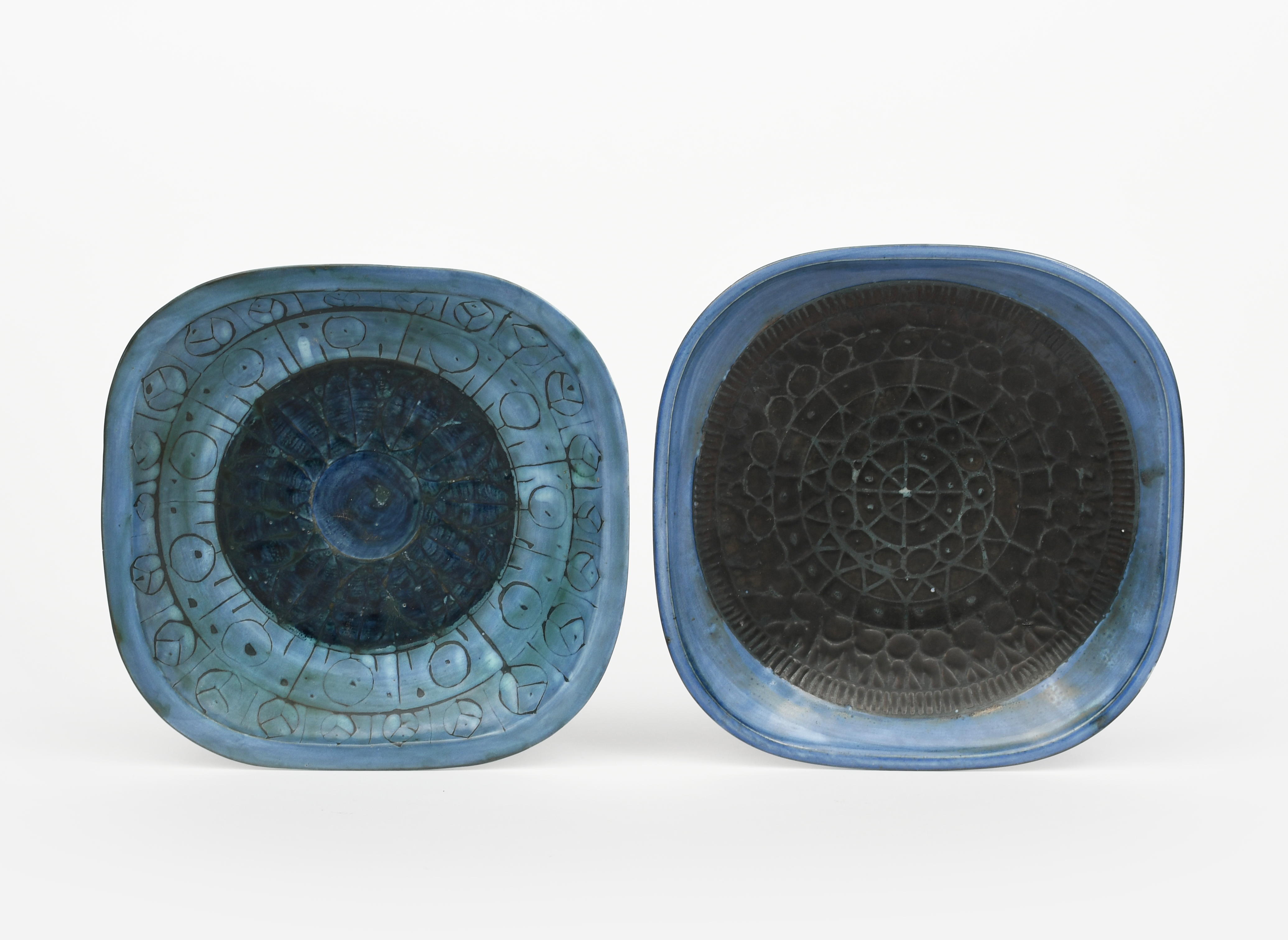 A Troika Pottery square dish, resist decorated with radiating geometric design in blue, and another similar with resist decorated roundel, impressed Troika Pottery St Ives and Trident mark, 18.5cm. square (2)