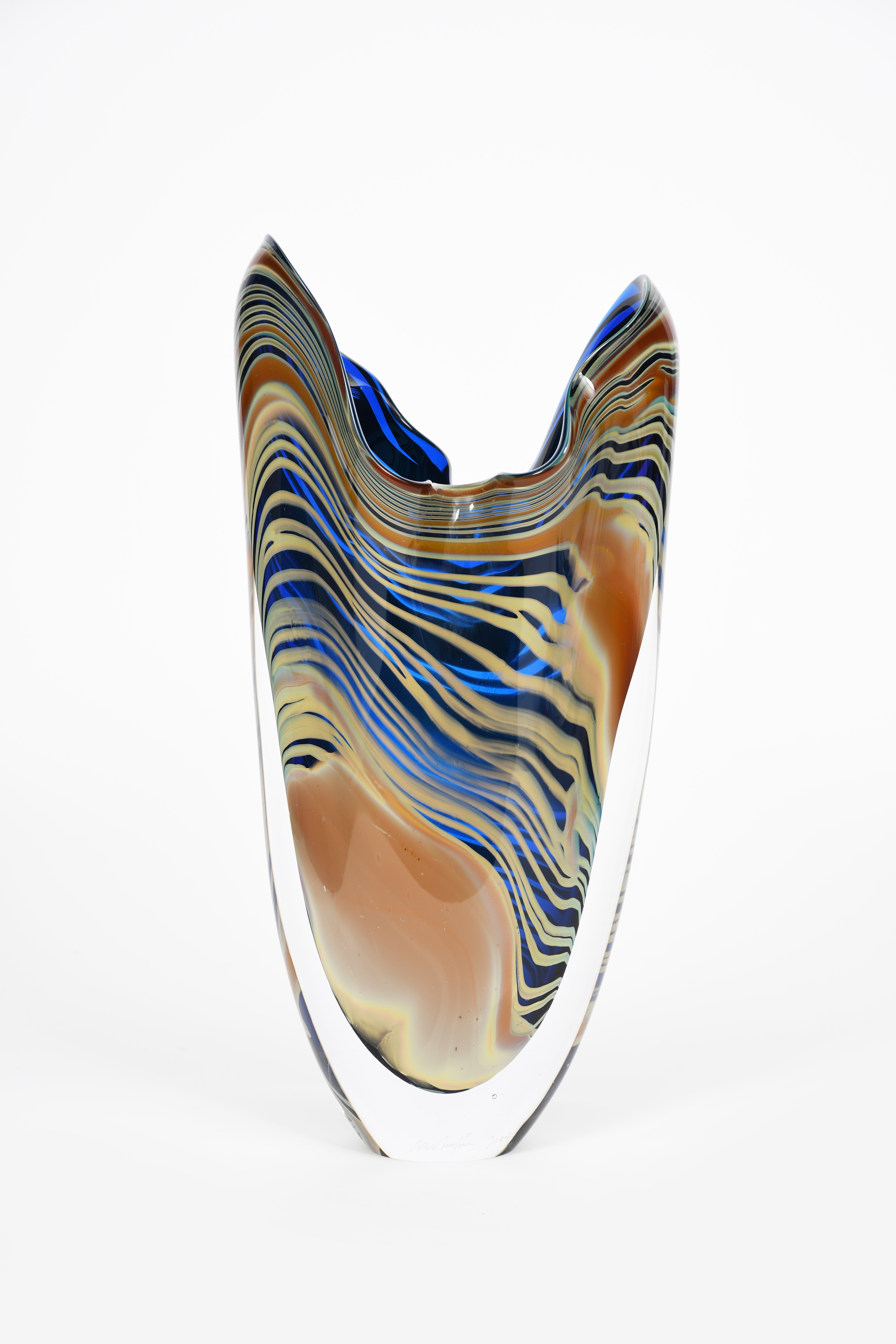 a cased glass vase, dated 2004, blue and coffee coloured strata cased in clear with pulled to rim, etched signature and date 38cm. high
