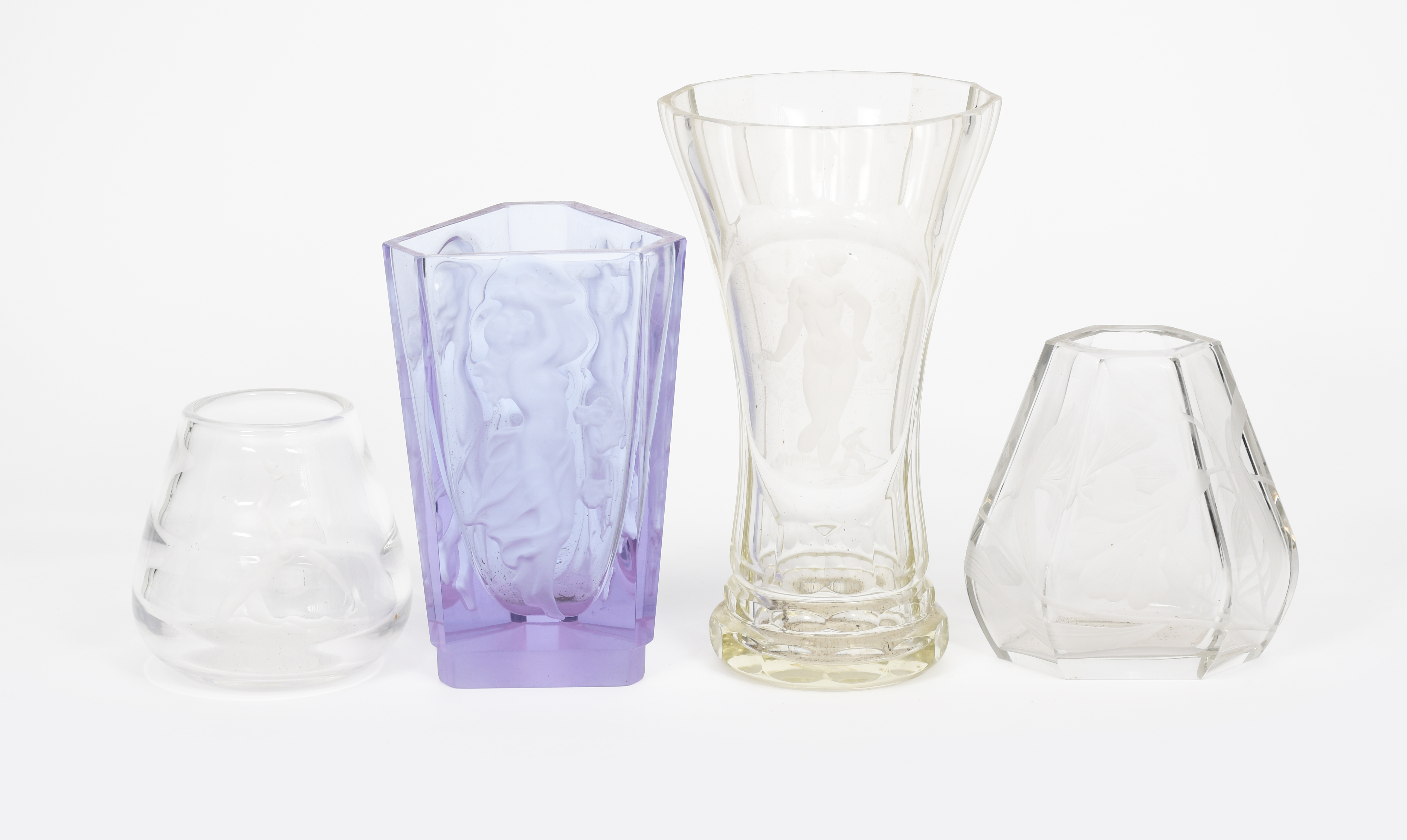 ‡ An engraved glass vase possibly Orrefors, model W.277, tapering cylindrical form, etched with a naked maiden offering up a large fish, another faceted glass vase decorated with a naked woman a cut glass vase possibly Moser decorated with flowers and Czechoslovakian purple glass vase various marks, 26.5cm. high (tallest vase), (4)
