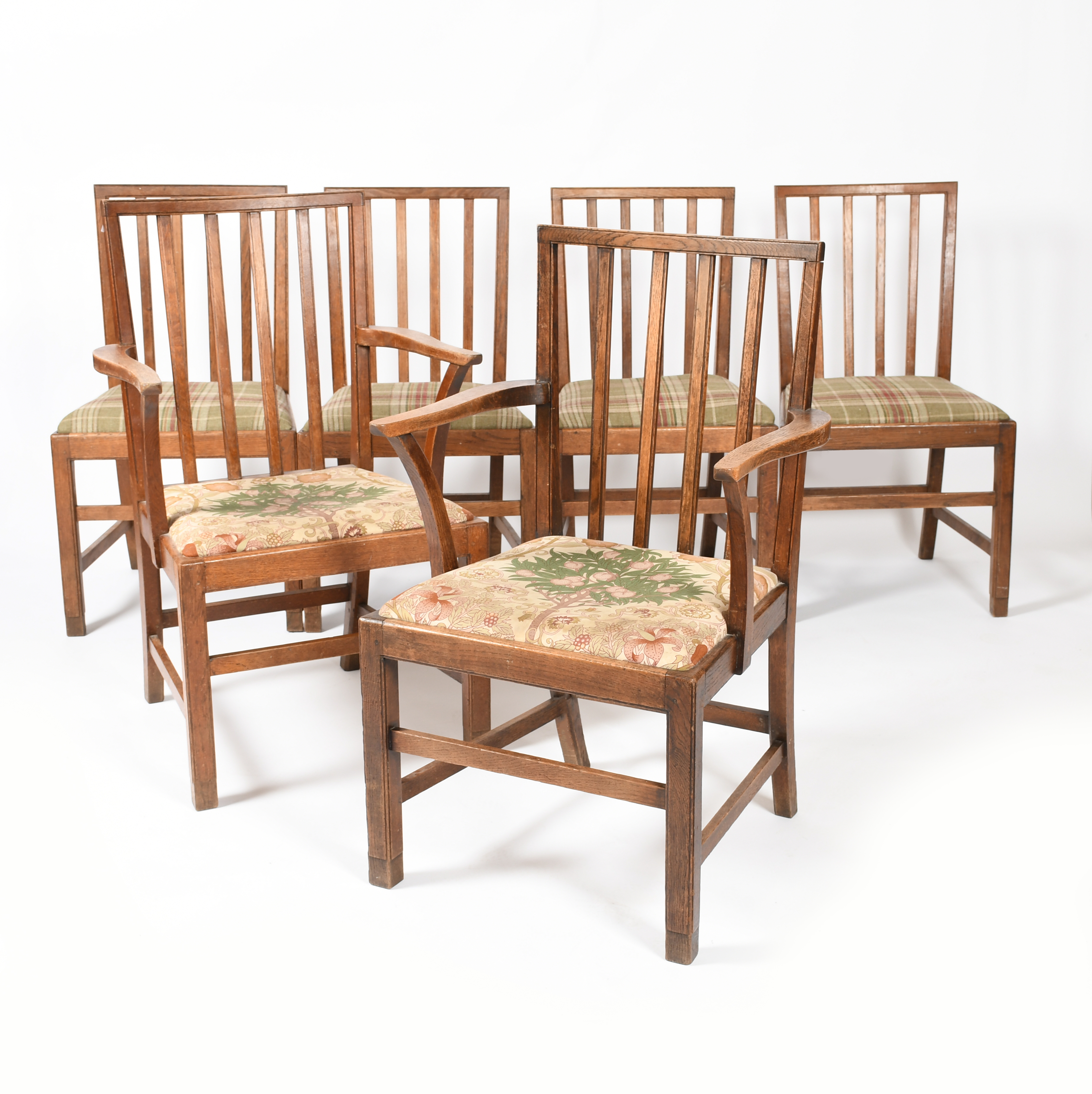 ‡ A set of six oak chairs in the manner of Edward Barnsley, dated 1952, comprising two carvers and four chairs with drop in seats, stamped numbers, crown mark, R Forresters & Sons, Wigan, 1952, 94cm. high (6)