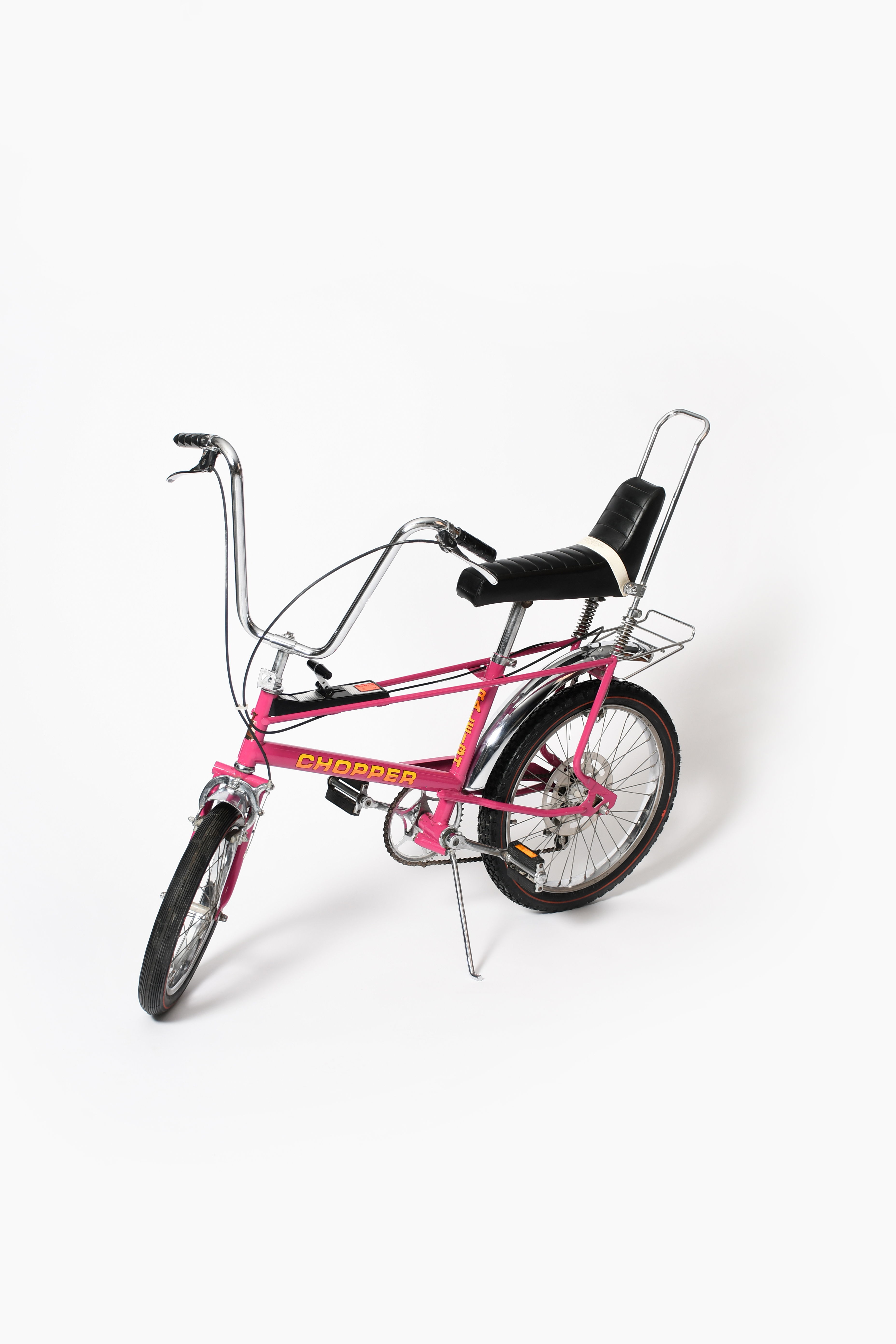 A Raleigh Mark II Chopper 3+2 bicycle, pink colourway, with five speed gear, applied Raleigh label to handlebars 135cm. wide, 107cm. high