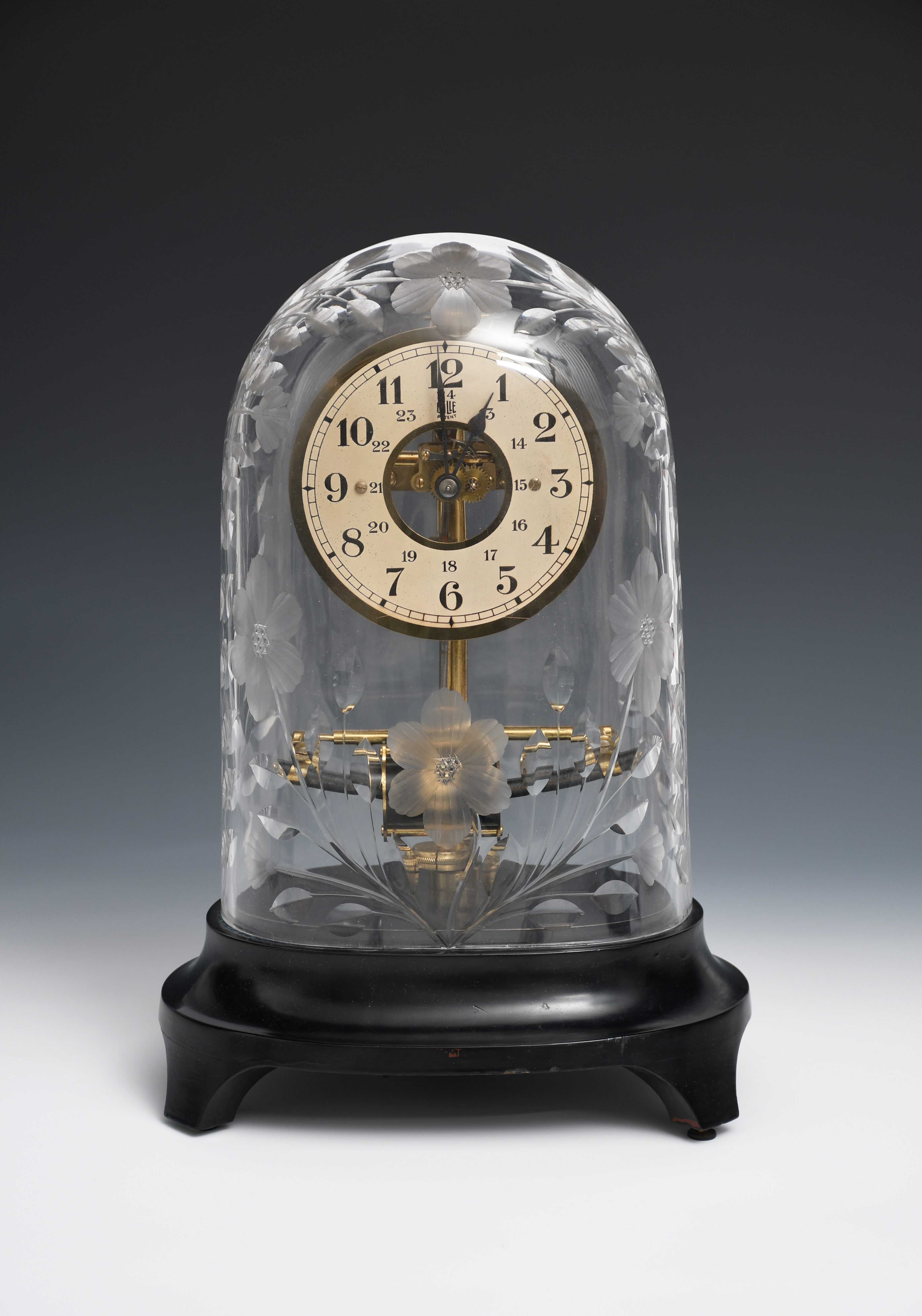 A modern Bulle patent electric clock, on ebonised wood base, the glass dome cut and etched with flowers and foliage unsigned, 37.5cm. high