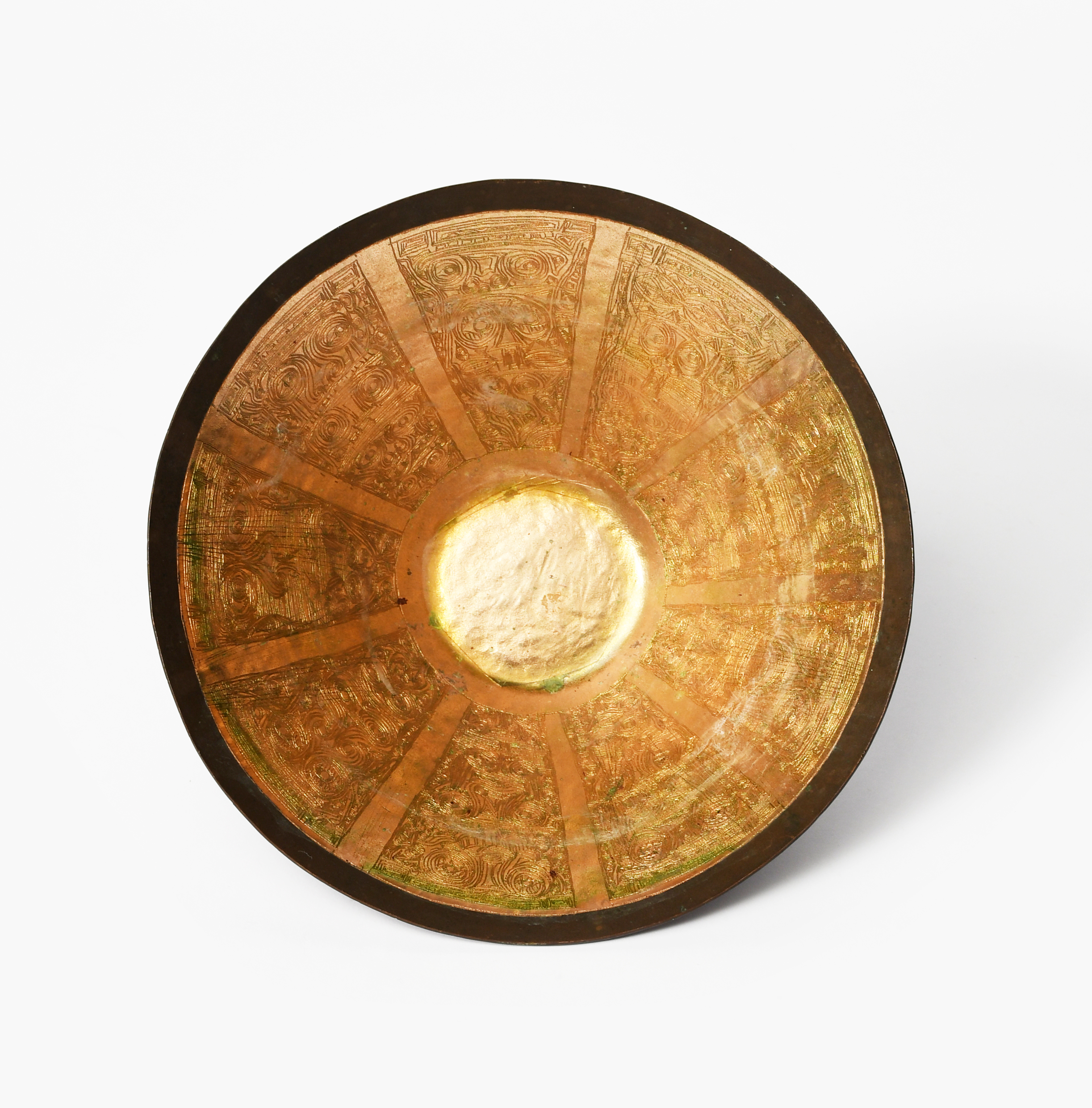 An enamelled copper bowl probably Italian, flaring conical form, internally decorated with panels of geometric design enamelled golden yellow, the exterior red, unsigned, 23.5cm. wide, 8.5cm. high