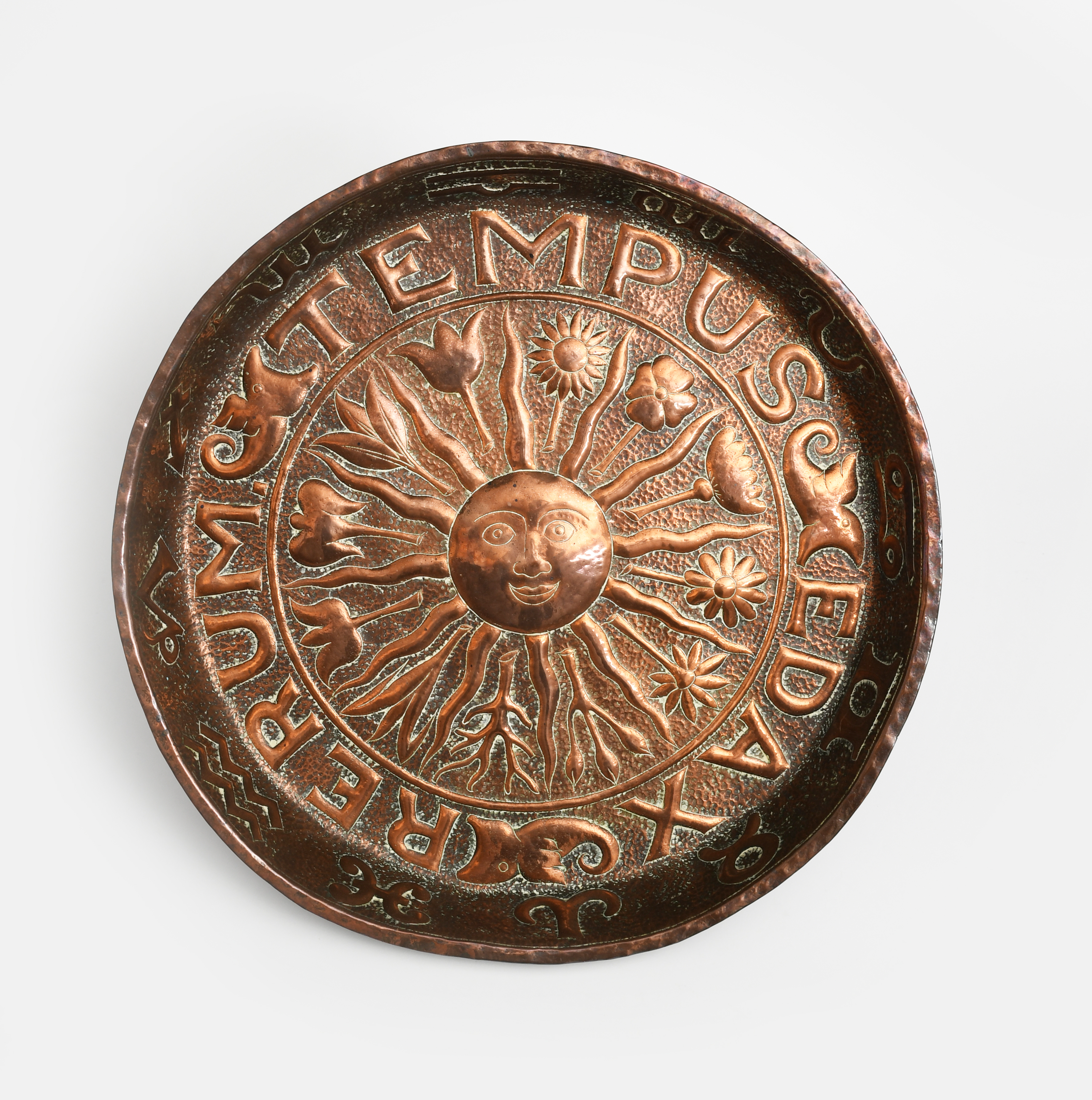 A large repousse copper Zodiac wall charger probably by John Pearson, the circular deep walled vessel hammered to the well with a stylised sun with radiating ray and flower stem design, inside inscription Tempus Edax Rerum, (time that devours all things), and stylised fish motif, the rim with zodiac signs, unsigned, 48cm. diam.