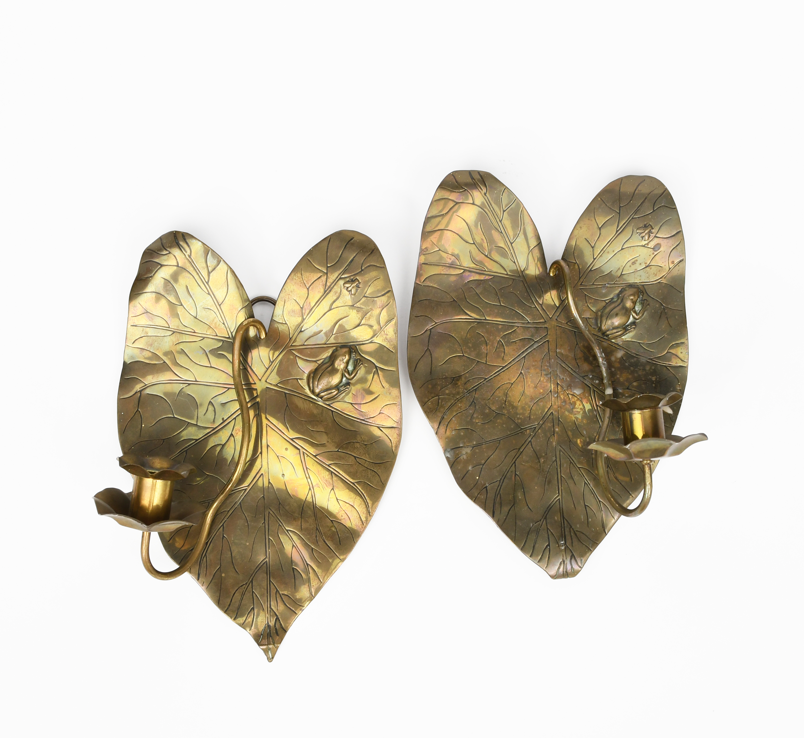 A pair of Aesthetic Movement brass wall sconce probably retailed by Liberty & Co, the reflector back-plate modelled as a large leaf with a small frog watching a fly, with loose floriform single sconce, unsigned, 27cm. high, (4)