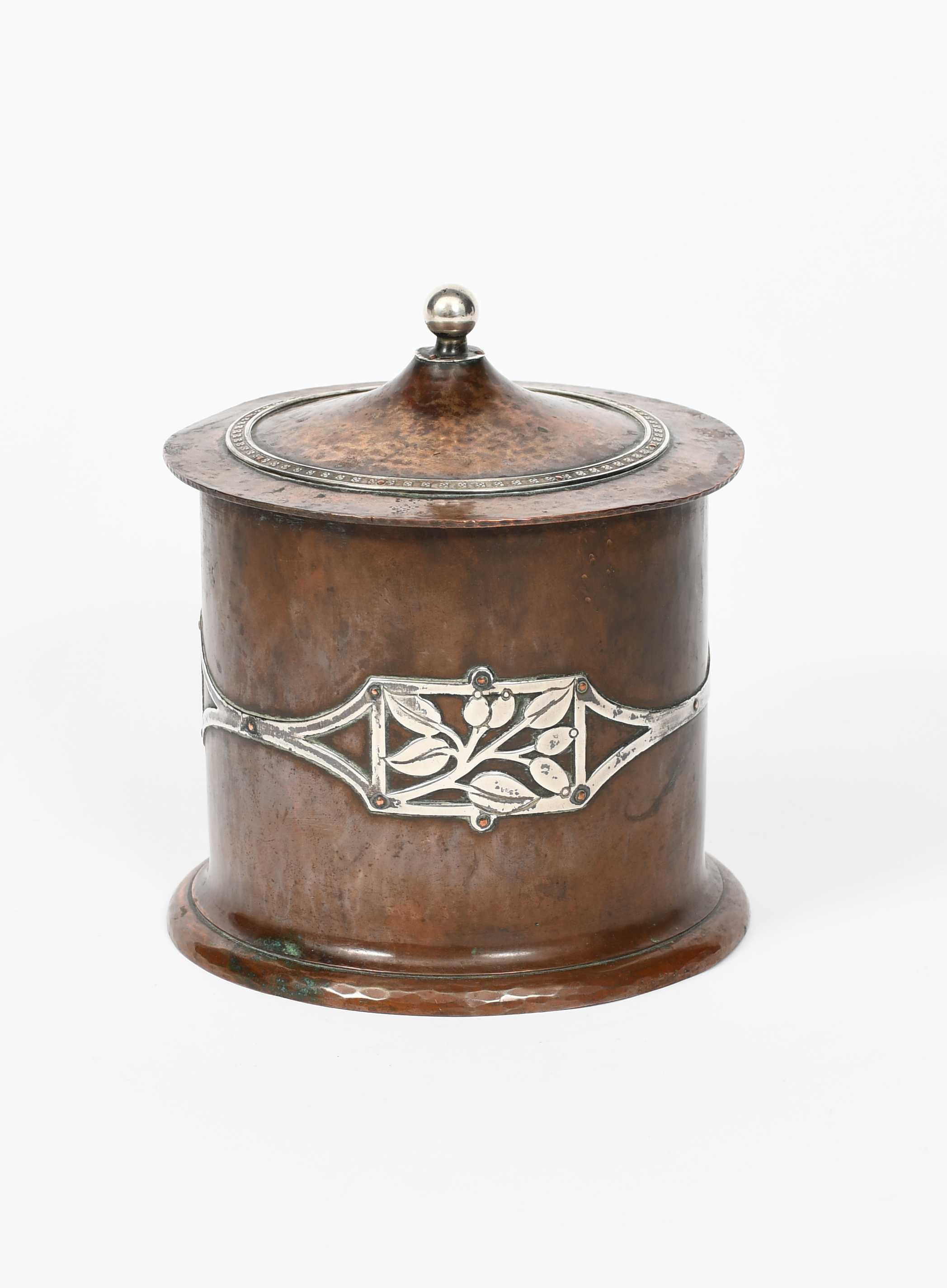 A mixed metal copper biscuit box and cover probably A E Jones, model no.2443, cylindrical hammered copper body with flaring foot, applied with a pierced band of silver foliate panels and strap-work, the shallow cover with ball finial and silver flower head repeat band, the silver applied with copper rivets, stamped 2443, 15.5cm. high, (2)