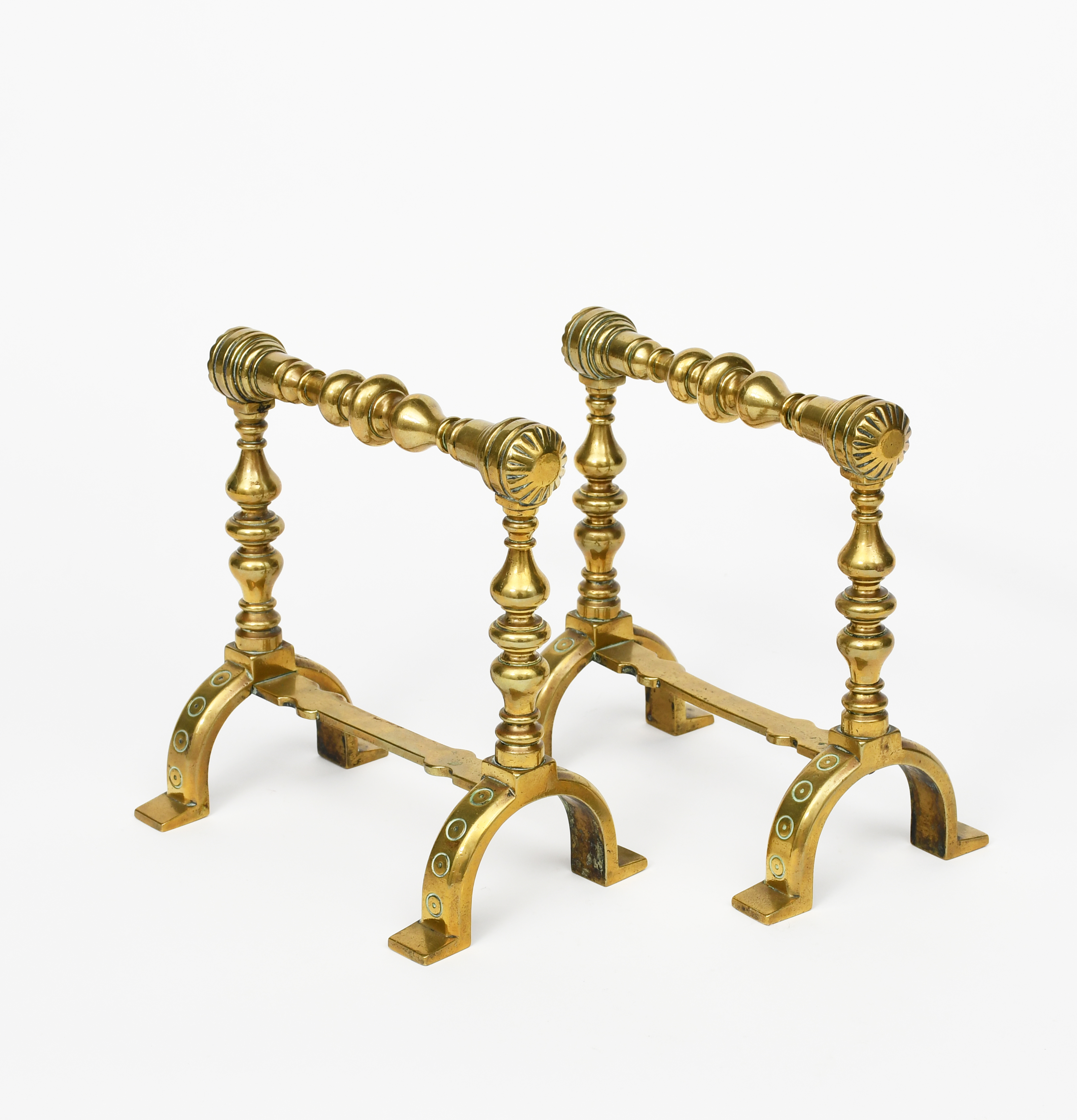 A pair of Benham and Froud brass fire dogs in the manner of Dr Christopher Dresser, on arched bases, stamped mark to foot, 19cm. high, 18cm wide