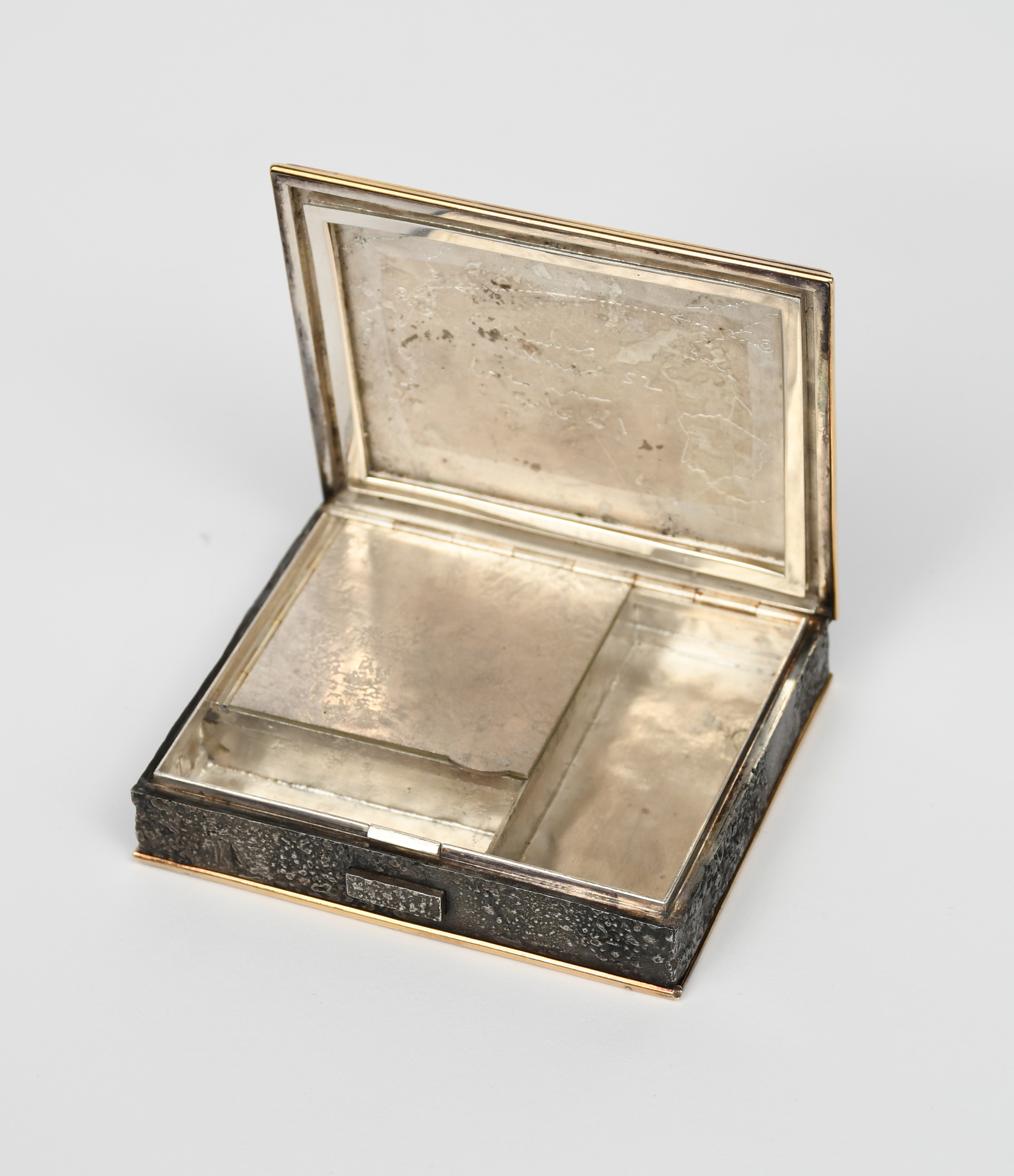 A Line Vautrin silver and bronze minaudiere, rectangular form with hinged cover, textured finish, the interior fitted with mirror housing, two open powder compartments and compartment with hinged cover, with fitted leather travel cover, stamped Minerva head mark, unsigned, 9.7 x 8.2cm.