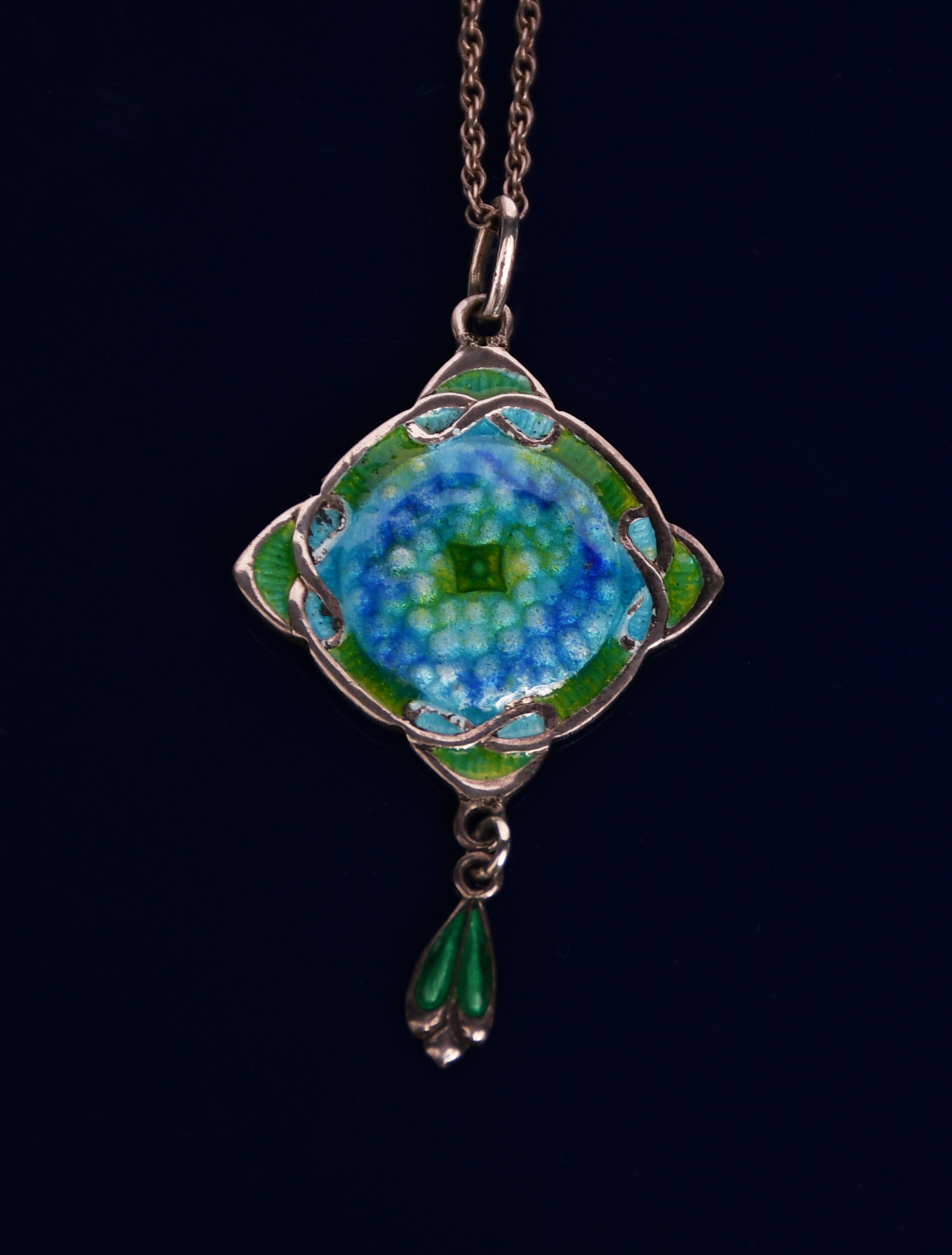 A James Fenton silver and enamel pendant necklace, square section cast in low relief, enamelled in shades of green and blue, with green enamelled drop, stamped marks, Birmingham, 1908, 4.5cm. long