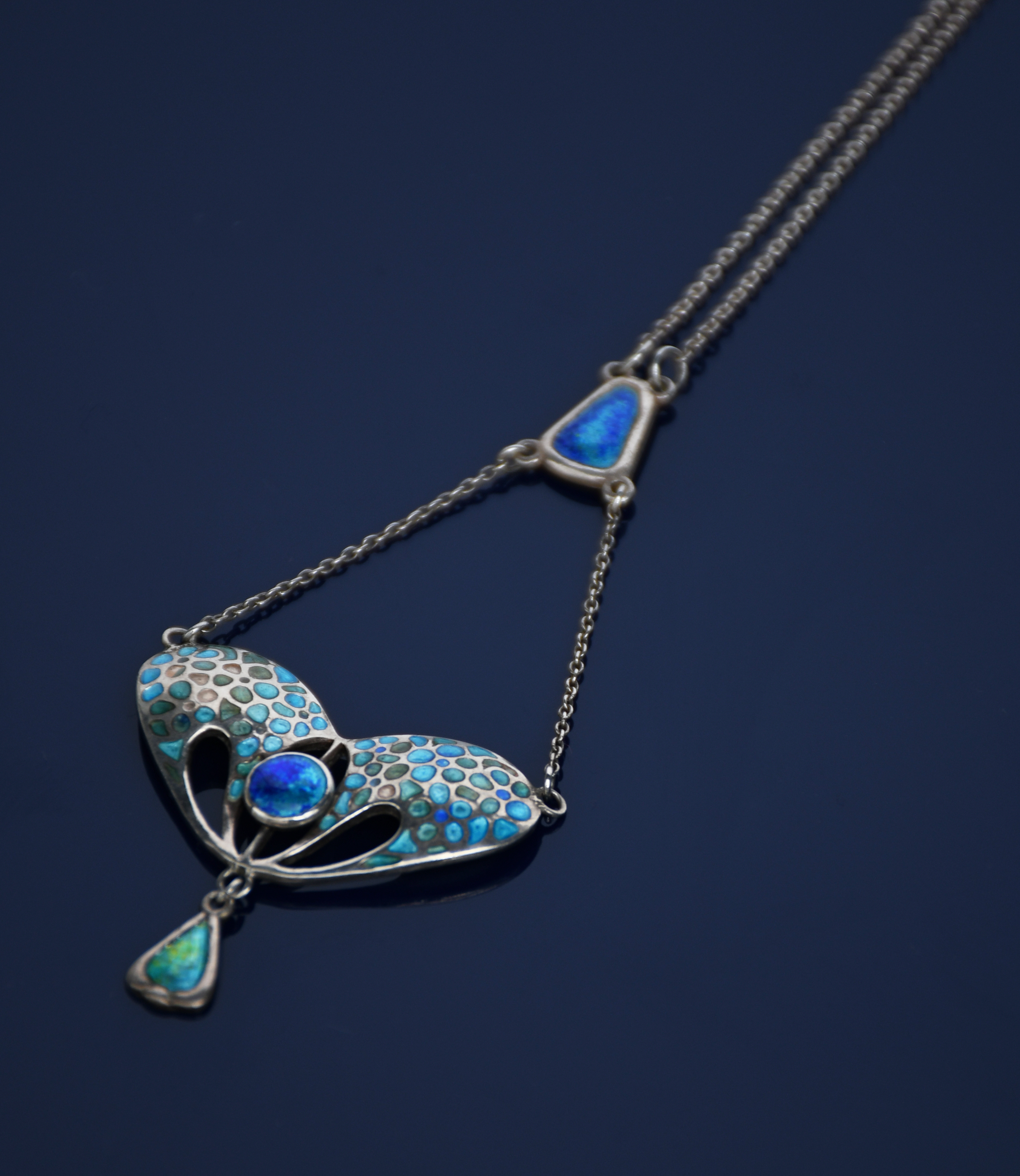 A Charles Horner silver and enamel pendant necklace, pierced and cast as a stylised moth, in blue and turquoise, stamped marks, Chester, 1910, 3cm. wide