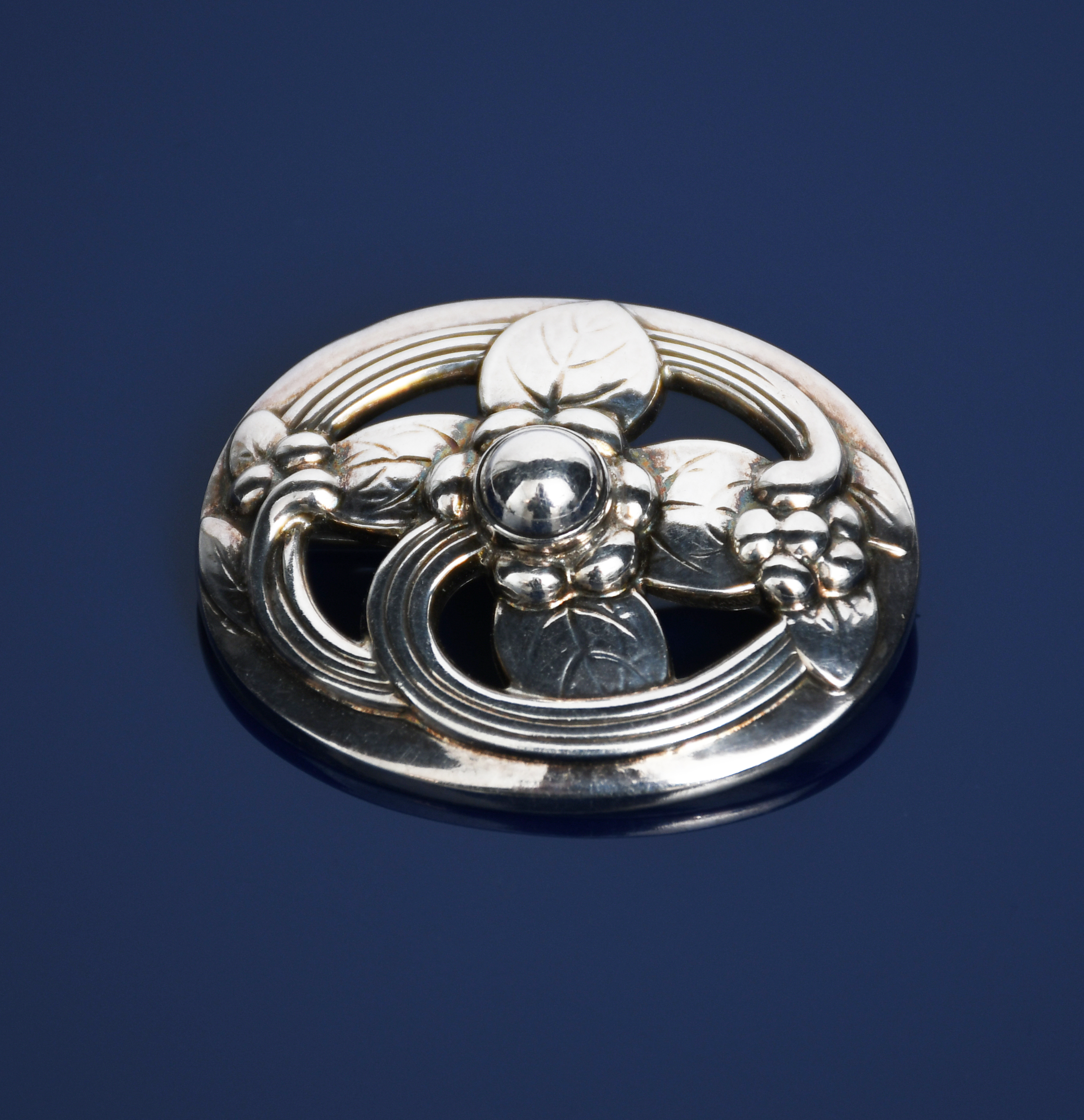 A Georg Jensen silver brooch designed by Georg Jensen, model no.138, oval, pierced and cast with a scrolling flower stem, stamped marks, 4cm. wide.
