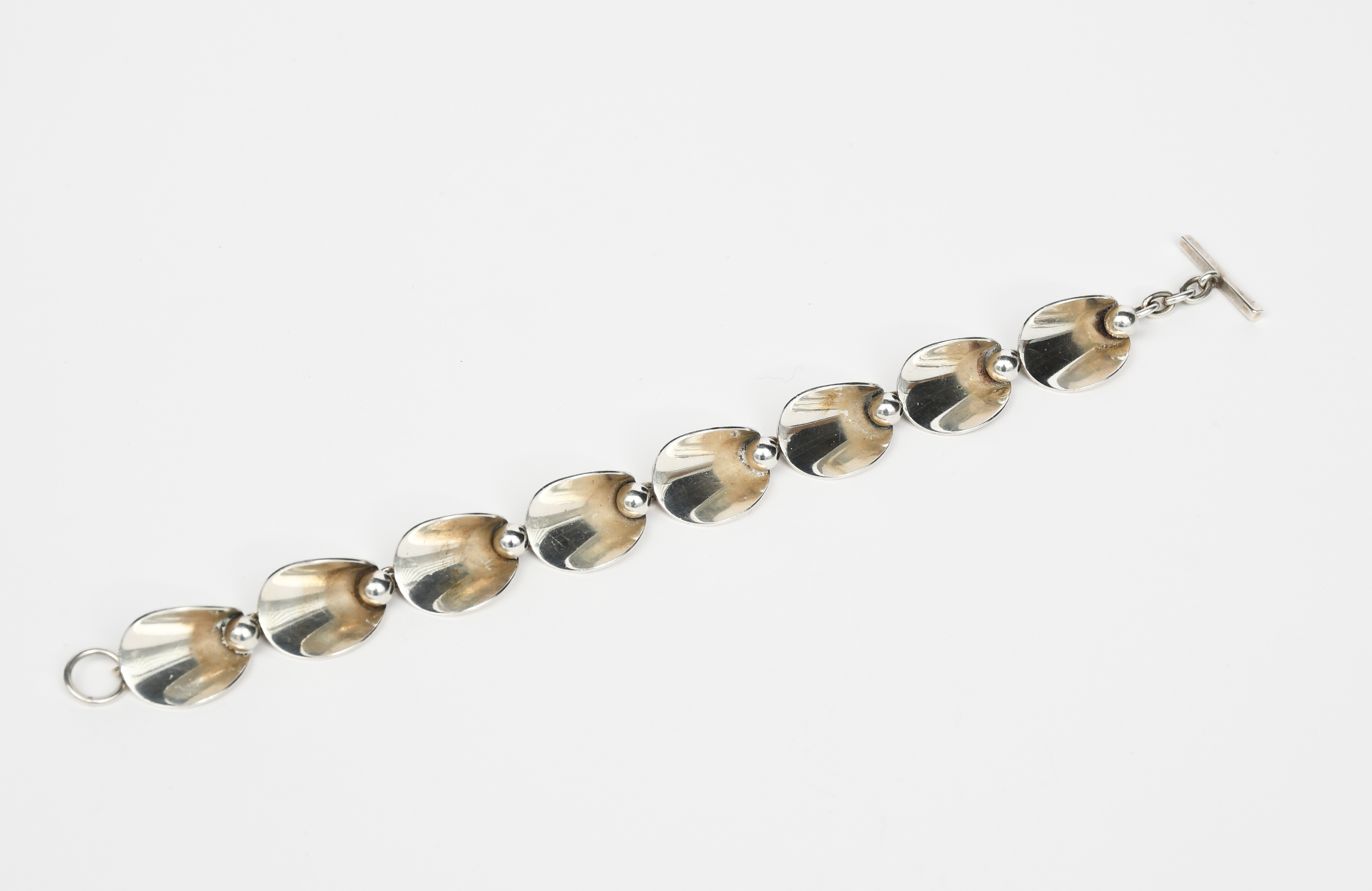 An N E From silver link bracelet, eight petal shaped links each with ball motif, stamped marks, 19cm. long