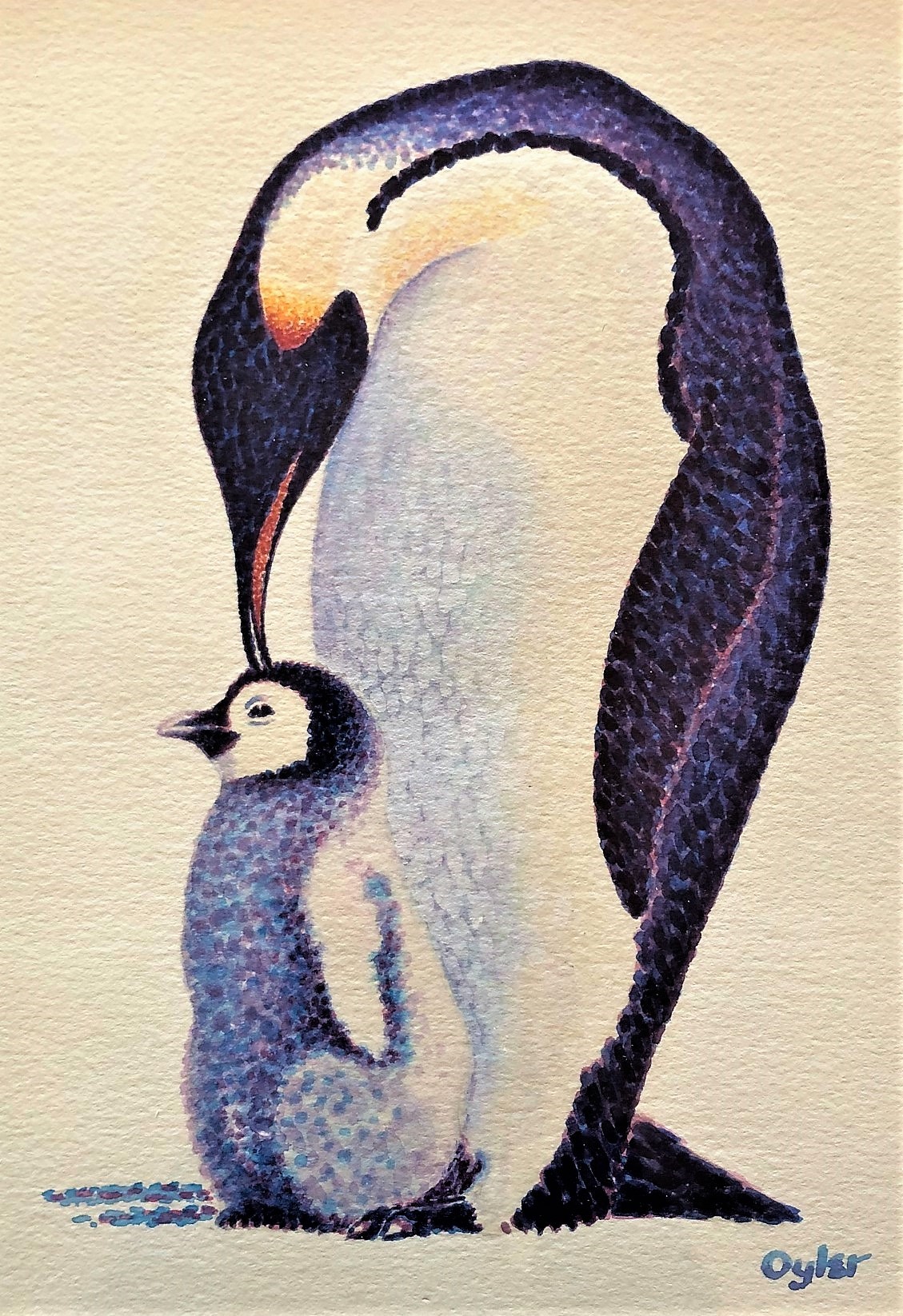 Sally Oyler travels widely, drawing inspiration from a variety of subjects and encounters, with amazing wildlife being the closest to her heart. One of her most inspiring journeys took her to see the Emperor penguins at their rookery on Snow Hill Island on the Antarctic peninsula. The Emperors, and especially their young chicks, were as inquisitive of her as she was of them.