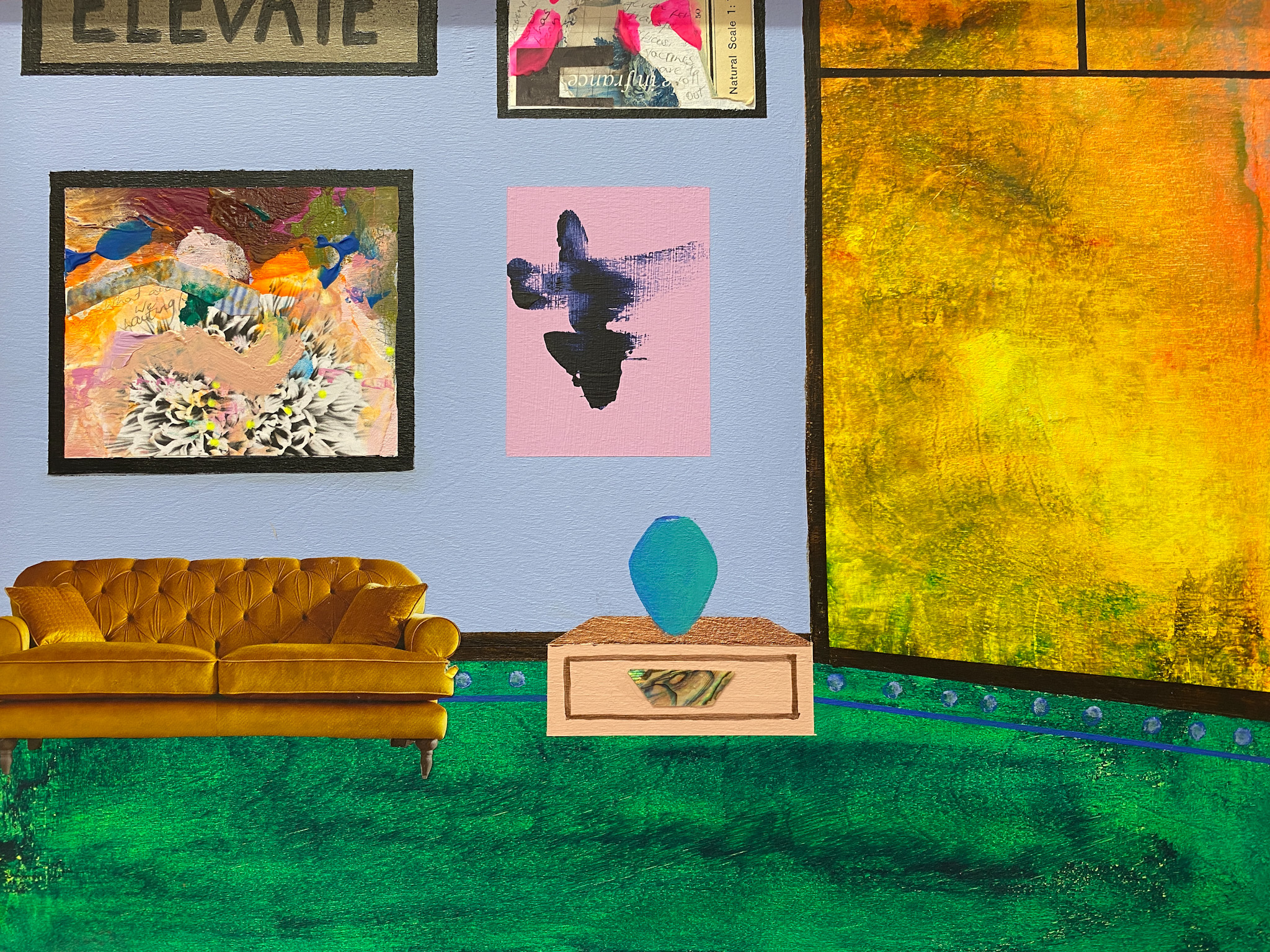 Acrylic, collage and mother-of-pearl on plywood