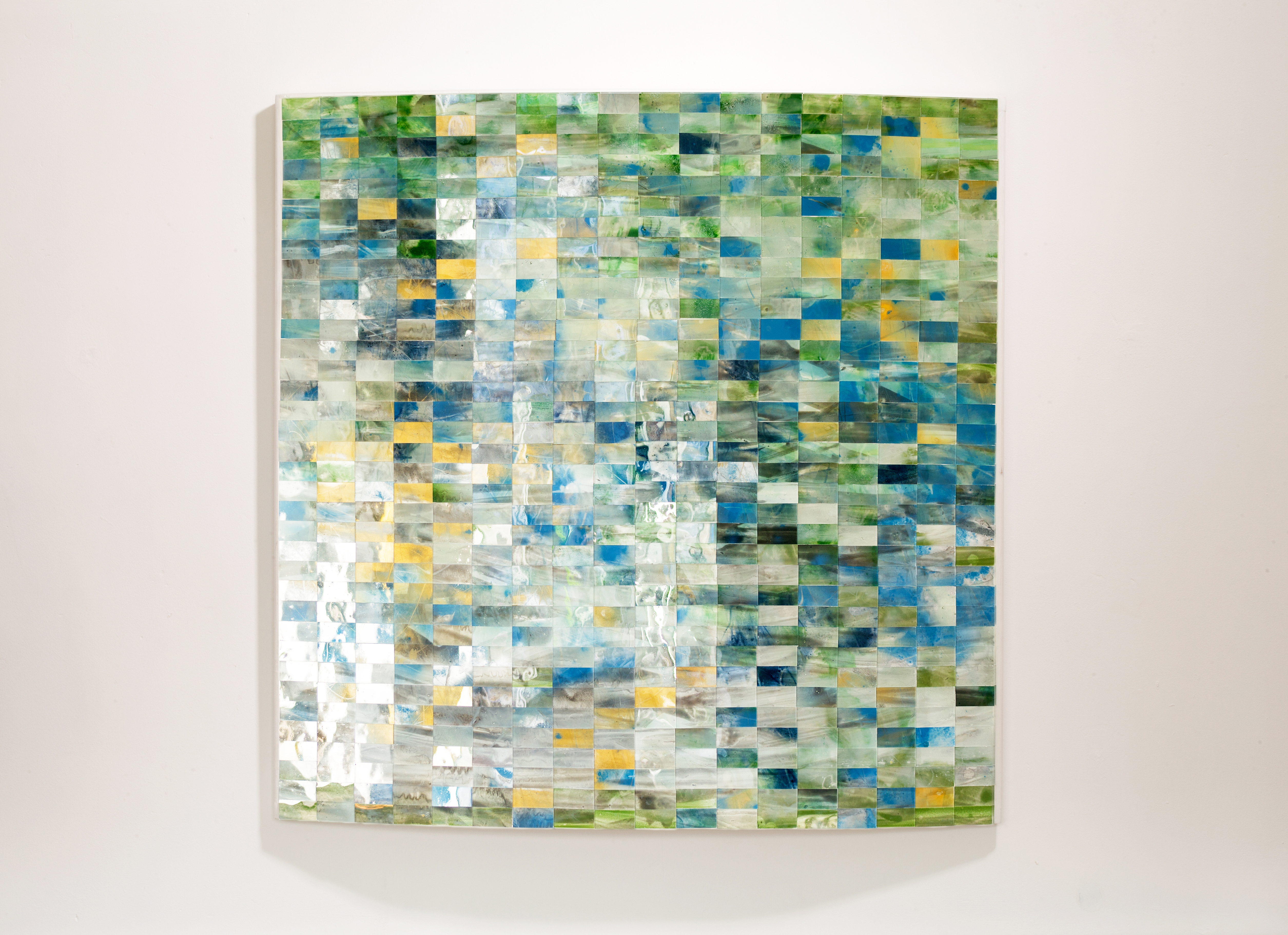 Description of the work: Vermeer are a series of curved reliefs whose reflective glass surface refracts the environment so that the viewer's perception switches between examining the image and the reflection. A painted response with glass enamels which are fired onto glass, cut up and collaged onto a curved timber frame which emphasizes the pixilated image. It is a system which questions what we see and how we see.