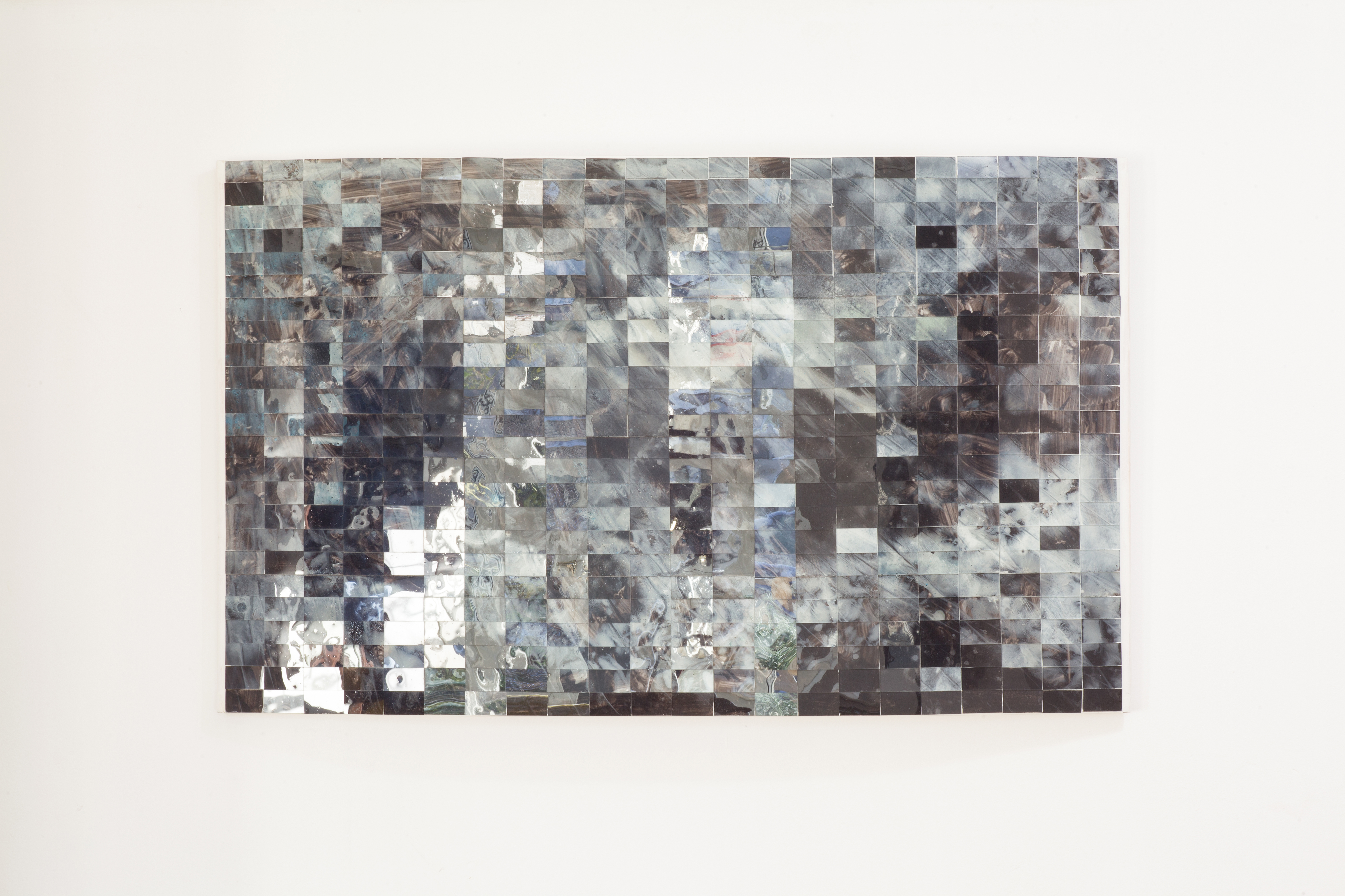 Description of the work: Vermeer are a series of curved reliefs whose reflective glass surface refracts the environment so that the viewer's perception switches between examining the image and the reflection. A painted response with glass enamels which are fired onto glass, cut up and collaged onto a curved timber frame which emphasizes the pixilated image. It is a system which questions what we see and how we see.